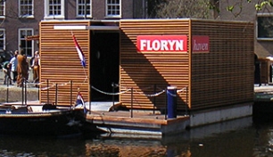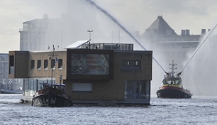 Het drijvende kantoor van Waternet is opgeleverd. Het drie verdiepingen tellende gebouw is feestelijk naar de bestemming gebracht. het is de thuishaven voor de bagger- en drijfvuilnisboten die de grachten en vaarwegen van Amsterdam schoonmaken.