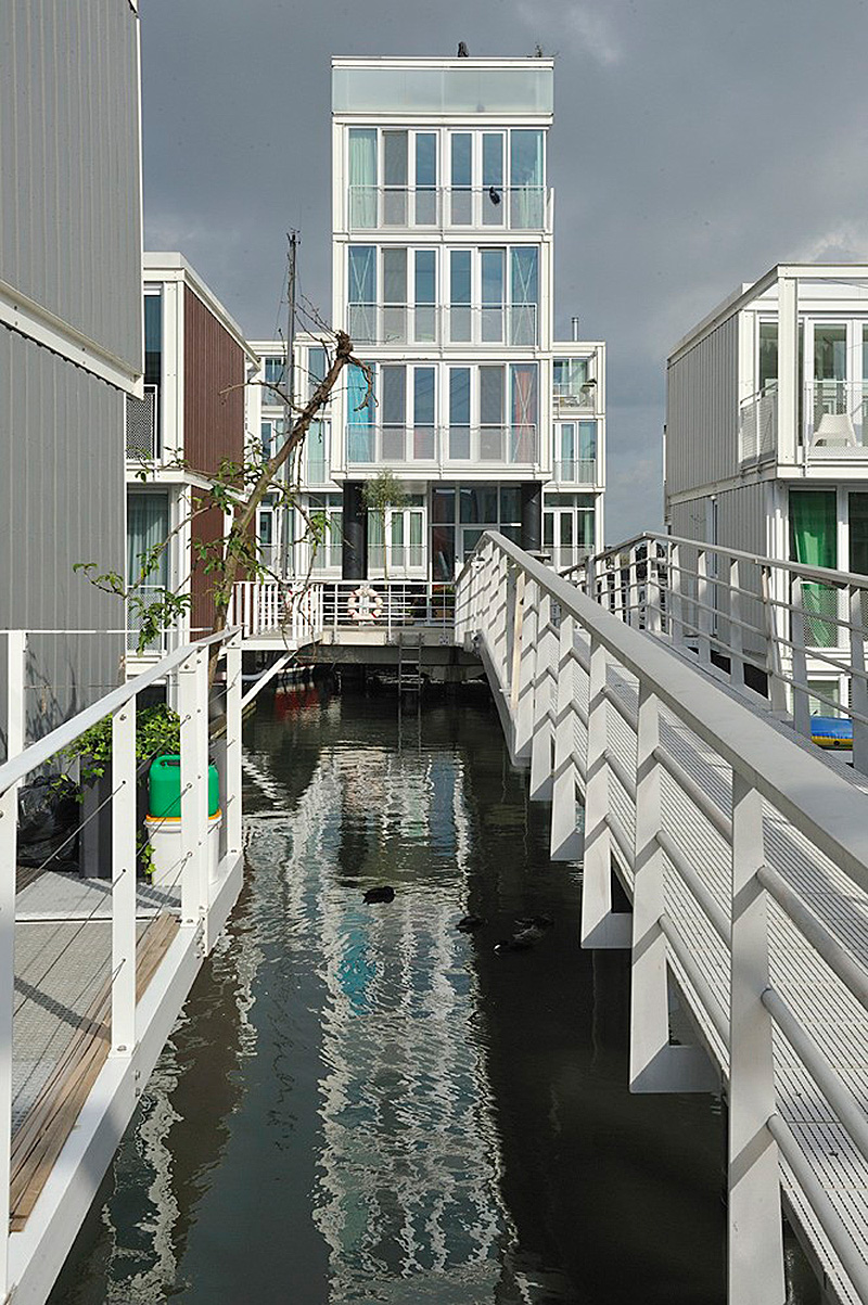 De waterwoningen zijn via 4 vaste steigers bereikbaar die onderling door bruggen zijn verbonden. In deze steigers liggen alle kabels, leidingen waarmee de drijvende woningen op alle nutsvoorzieningen zijn aangesloten. De steigers zijn autovrij en zijn aan beide zijden voorzien van een reling waarin verlichting is opgenomen.