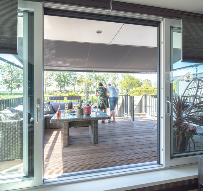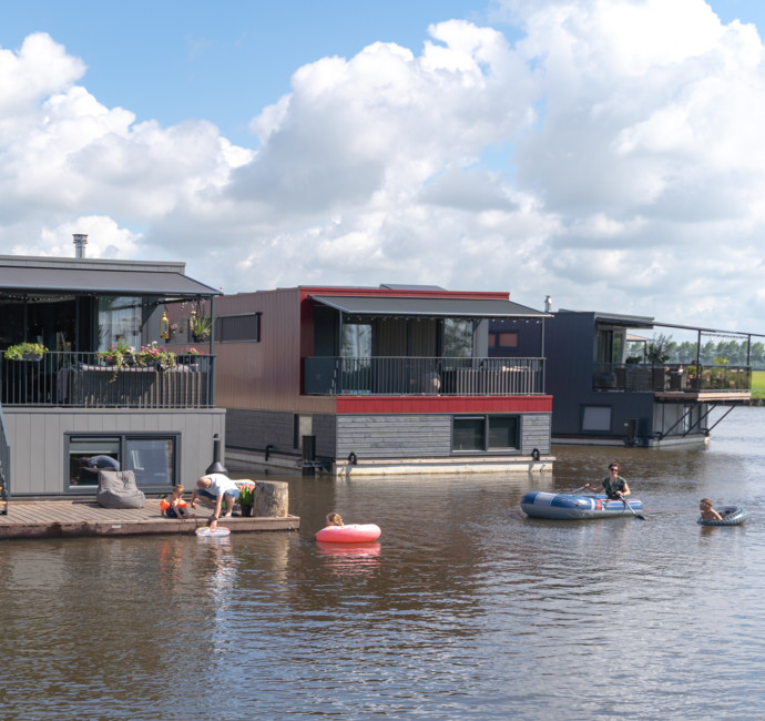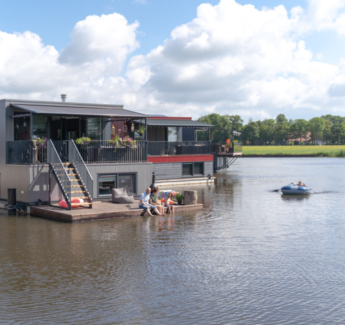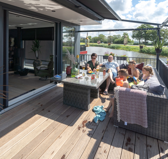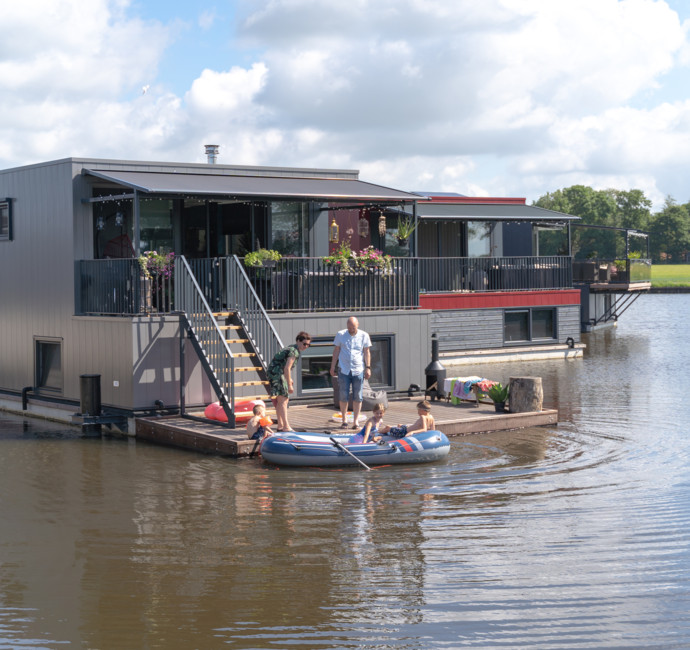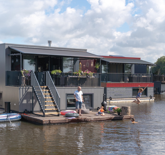 Een nadeel van later in een project instappen is dat sommige bouwsuggesties niet meer mogelijk zijn, zoals een verlengd terras. We hadden graag het terras wat groter gezien omdat we 3 kinderen hebben. We hebben toen gekozen voor een drijvend terras. Daar ligt ons rubberbootje aan en we hebben er een zwemtrapje aan bevestigd. De kinderen hebben hier al erg veel plezier aan beleefd! En ’s avonds genieten we daar heerlijk bij ons tuinhaardje. Zo ervaren wij echt de waterbeleving. Wie weet als het nog eens gaat vriezen... dan binden we zo de schaatsen onder vanaf de vlonder!