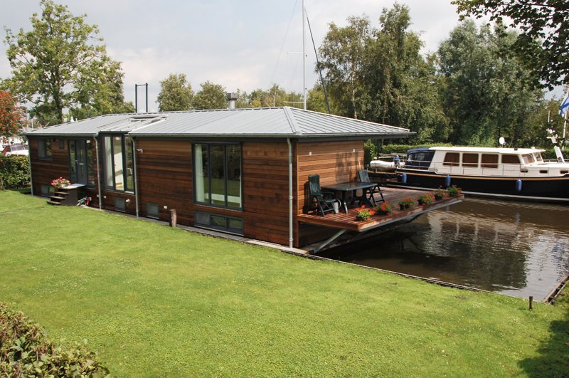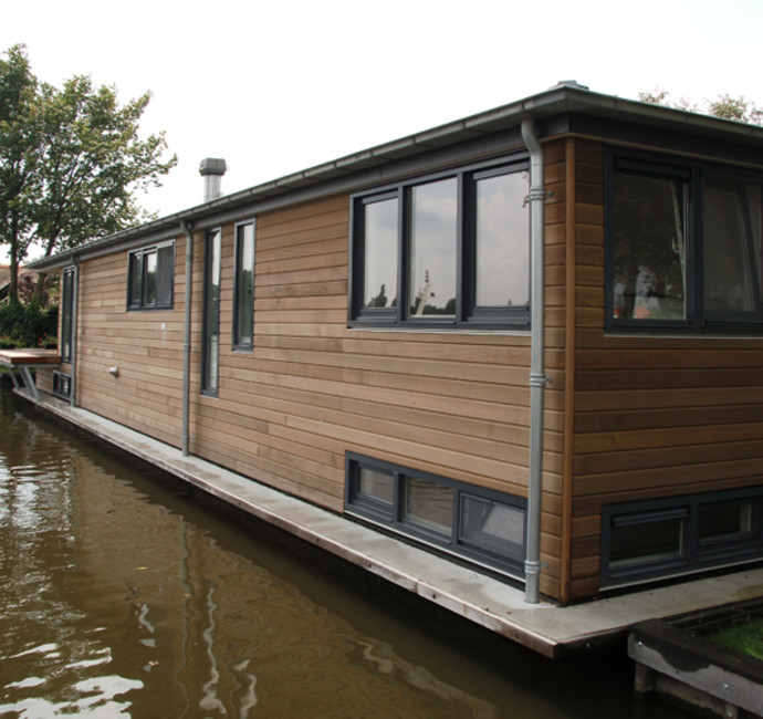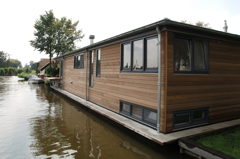 Met een flink aantal grote ramen, valt er veel licht naar binnen en heb je dus ook een magnifiek uitzicht. Het puntdak van de woonark is uitgevoerd in zink, niet goedkoop maar wel mooi. De bekleding is red cedar, nu nog met een warme gloed, maar het begint hier en daar al wat te vergrijzen. Aan de waterkant heeft de ark een driehoeksvormig terras dat naar links nog een stukje doorloopt.