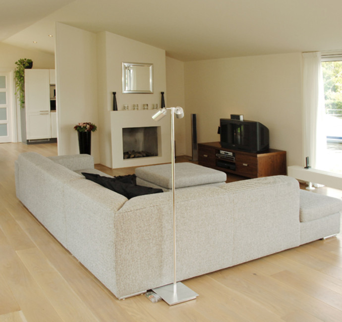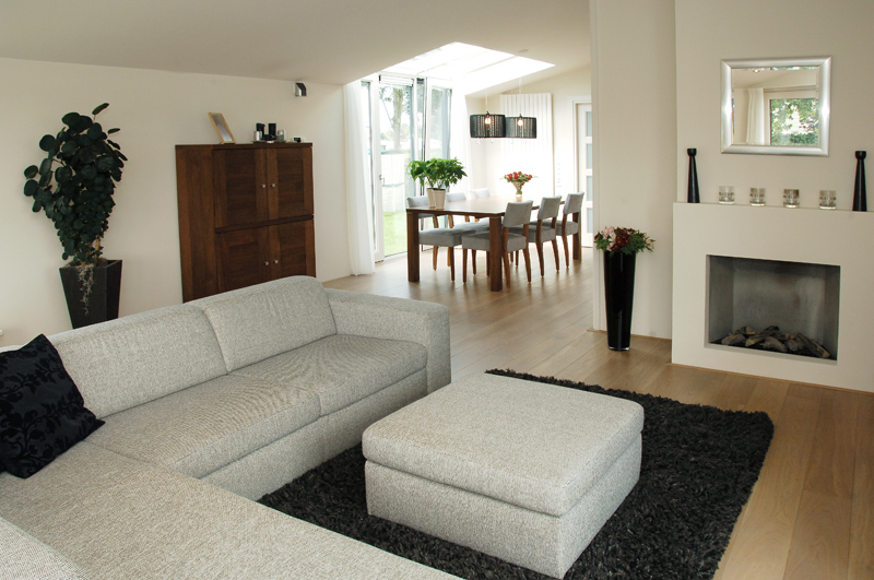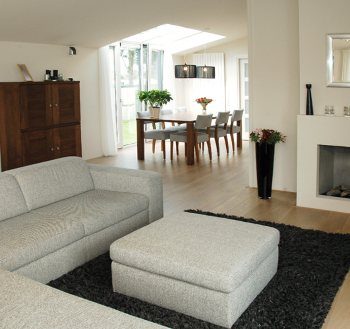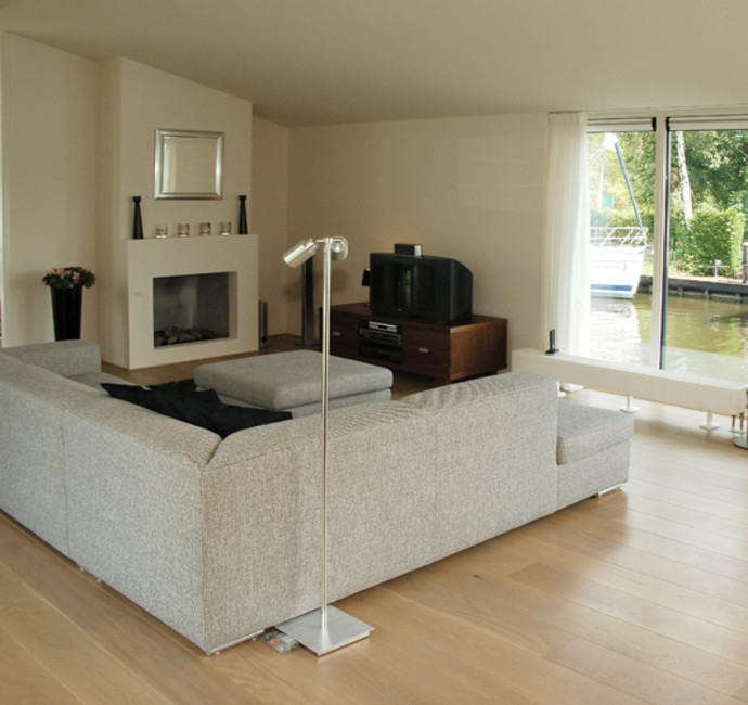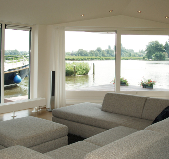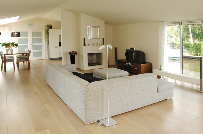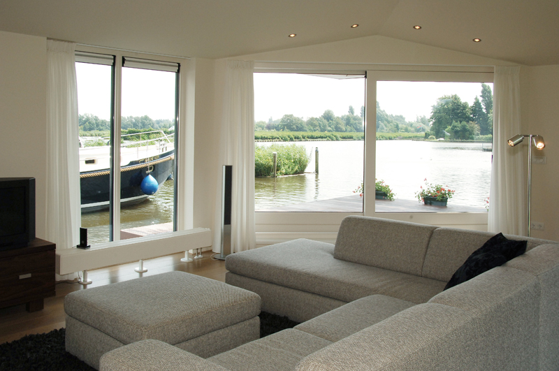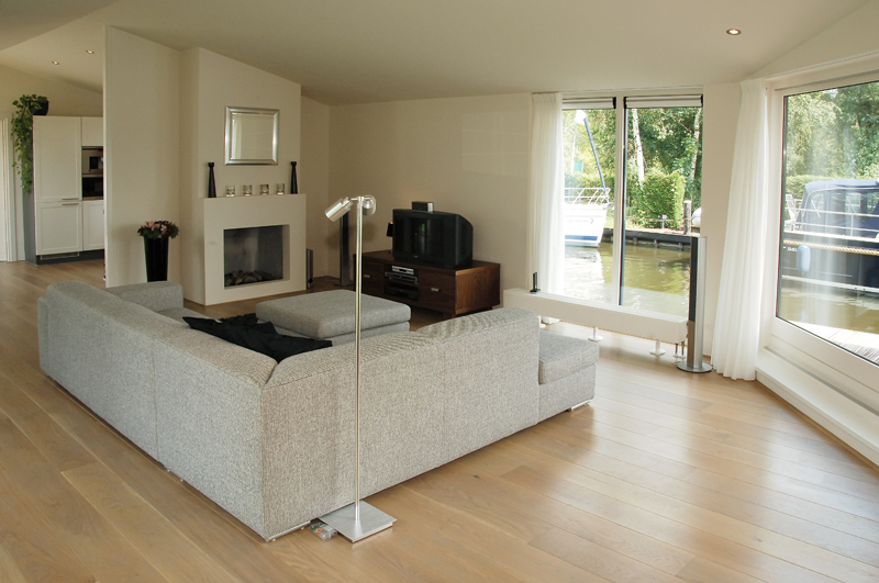 De entree is een echte hal met grote vensters en een houten trap. Links is een ruime bijkeuken en de technische ruimte. Ook links bevindt zich het kantoor met een prachtig uitzicht op de jachthaven. De heerlijke hoekkeuken, door ABC geregeld, heeft aan de overzijde een soort serre-achtig gedeelte met ramen die doorlopen tot in het plafond. Hierna komen we in de woonkamer, met (gas)haard en een brede schuifpui. Ook hier is het uitzicht fantastisch.