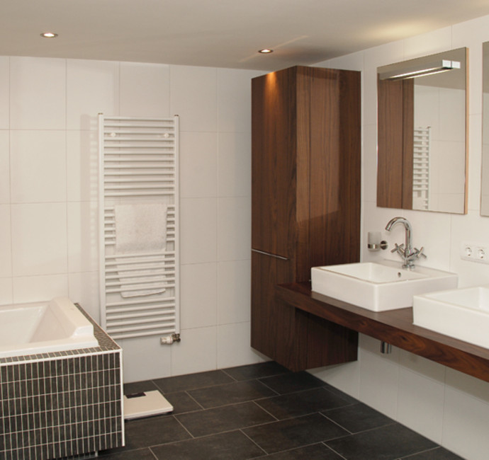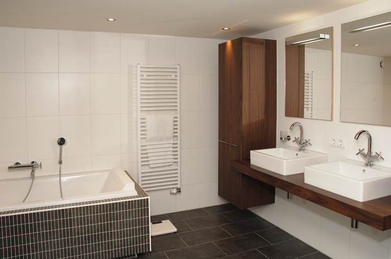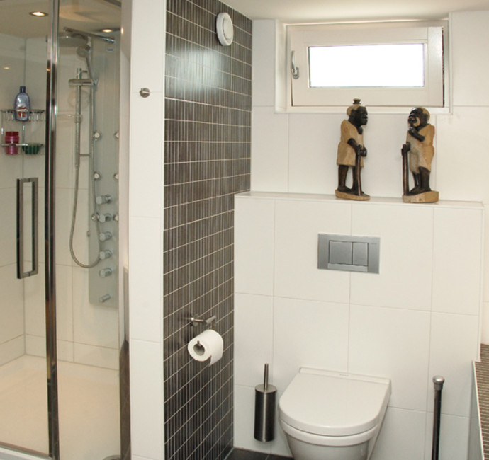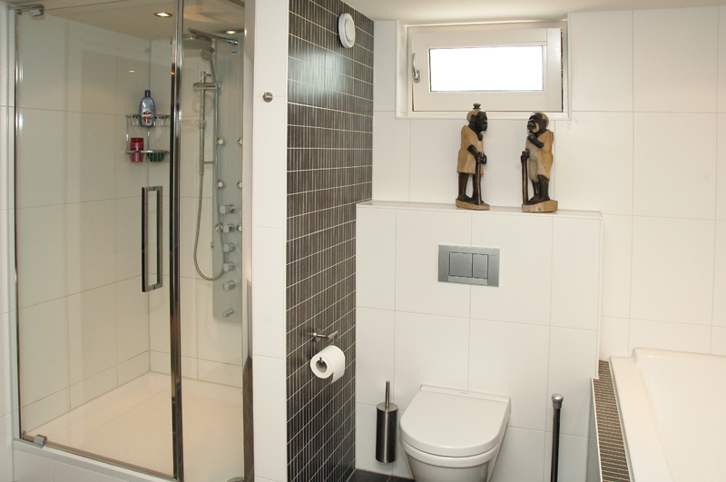 Via de hal bereiken we de benedenverdieping. Hier vinden we twee kleine logeerkamers. Dan een washok en een eerste badkamer, compleet met douchehoek. De ouderslaapkamer heeft een veel ruimere badkamer en een meterslange kastenwand. Heel praktisch.