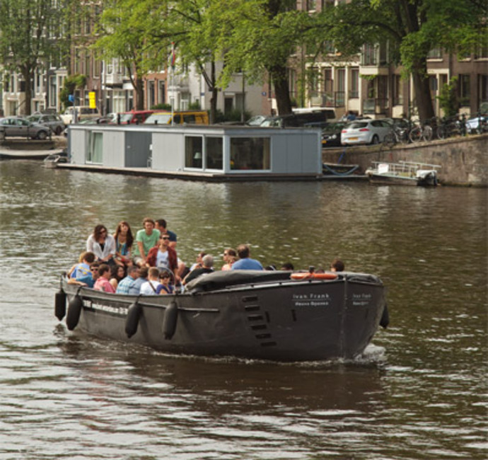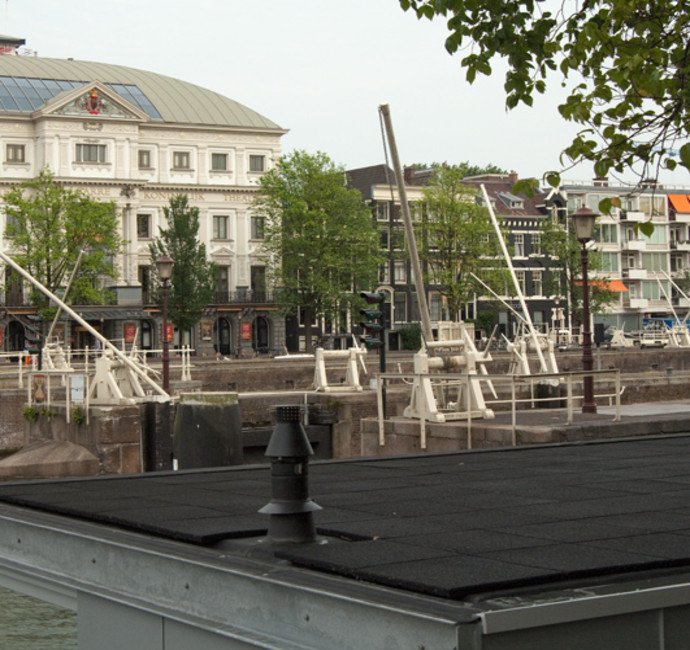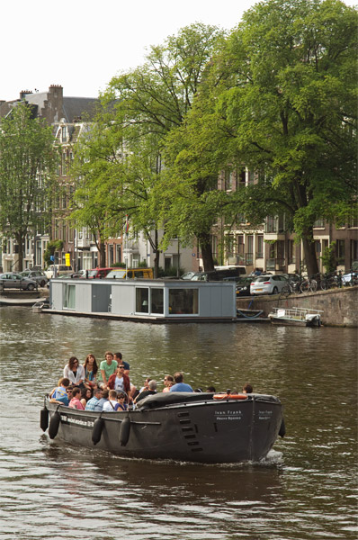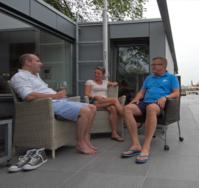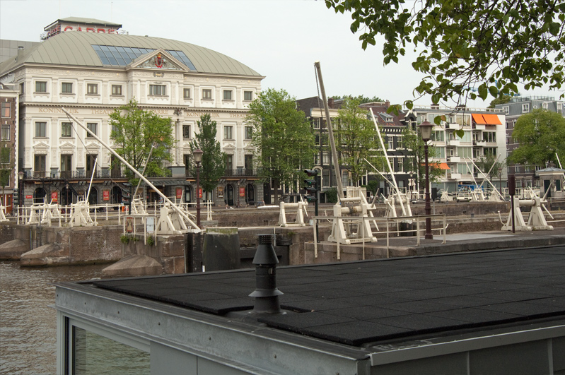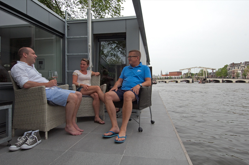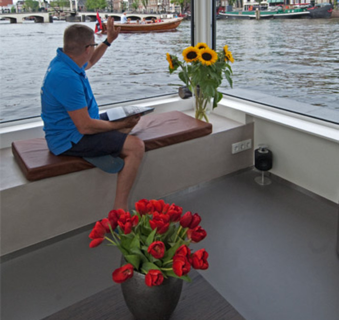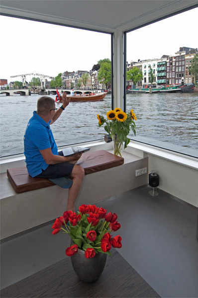 Hans kocht zijn eerste waterwoning op deze historische plek in de Amstel, tegenover Carré, tussen de Amstelsluizen en de ingang naar de Prinsengracht. Maar de ark was niet helemaal naar mijn zin. Toen ik voor de rioolaansluiting toch alles overhoop moest halen, heb ik een nieuwe laten bouwen. De bouw verliep soepel. Ik kon onderweg nog van alles aanpassen en men dacht goed mee.’