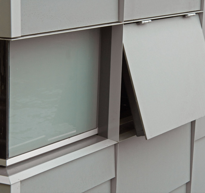 De buitenwandbekleding valt meteen op. ‘Ik wilde iets onderhoudsarms. Het doorlopende stalen U-profiel aan de achter- en zijkant is ook een idee van de architect; hij vindt het mooi de constructie zichtbaar te laten.’