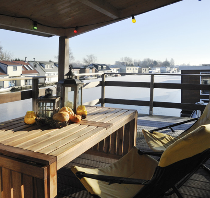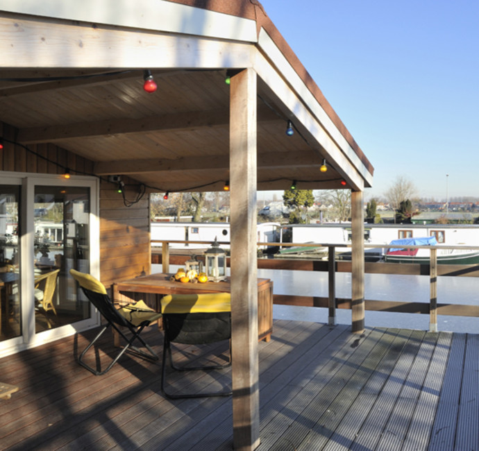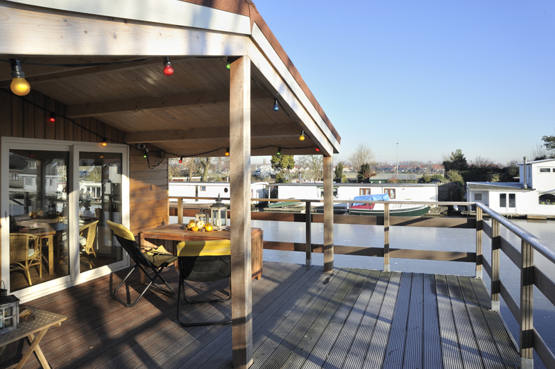 Het terras naast de woonkamer is het mooiste plekje van de ark. Echt een aanwinst. Het is voor een deel overdekt, staat op prachtige houten palen en doet een beetje Oosters aan. We zitten er ook als het een beetje regent. Je hebt een prachtig uitzicht over het kanaal.