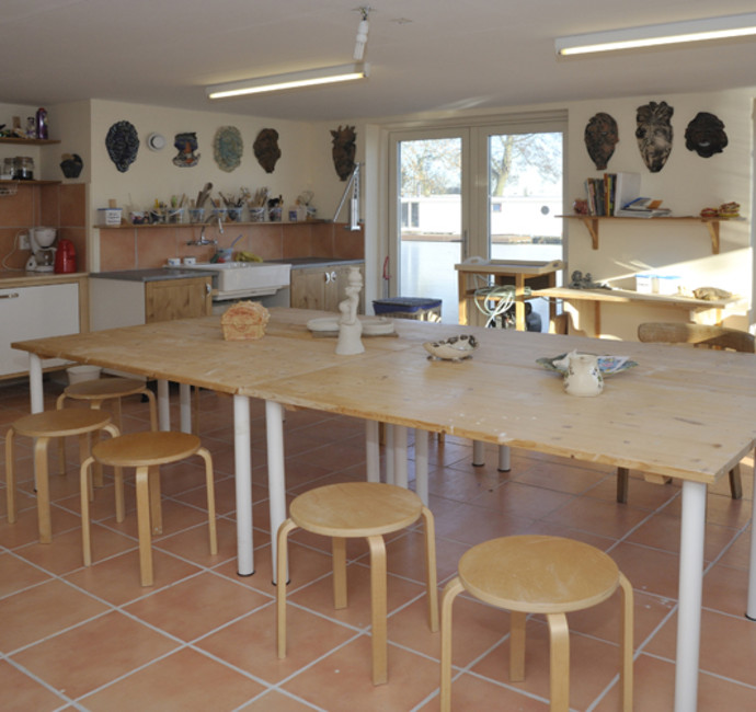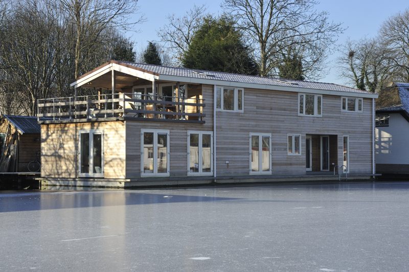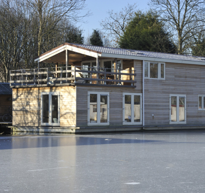 De ark bestaat uit twee verdiepingen. Maar omdat Richard en Elise niet ‘in de bak’ willen wonen, is de verdiepingsvloer op de waterlijn geplaatst. Hier op het waterniveau zijn de slaapkamer, logeerkamer, badkamer en het atelier gesitueerd. Vanuit één van de slaapkamers stap je zo op het inpandige terras. Op de bovenverdieping vind je de grote woonkamer, de open keuken en het grote terras.