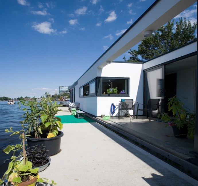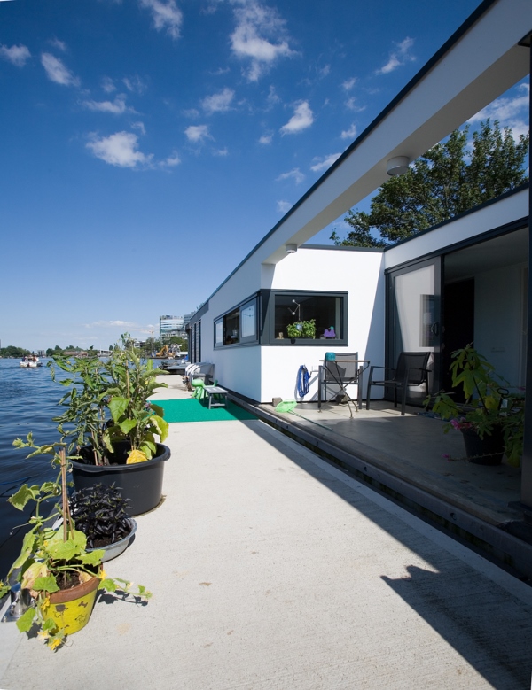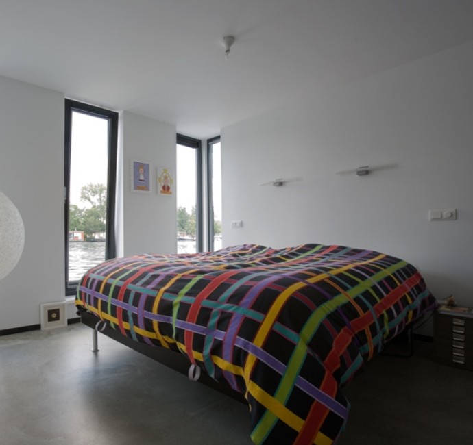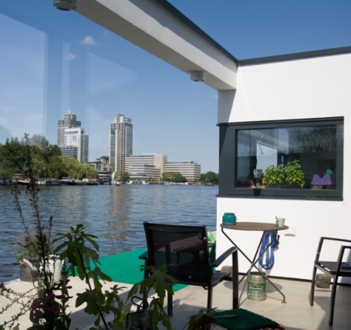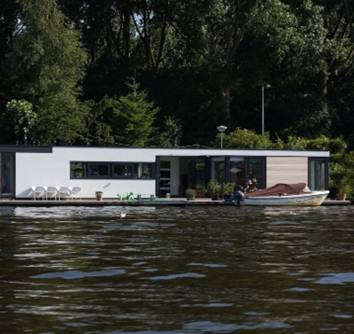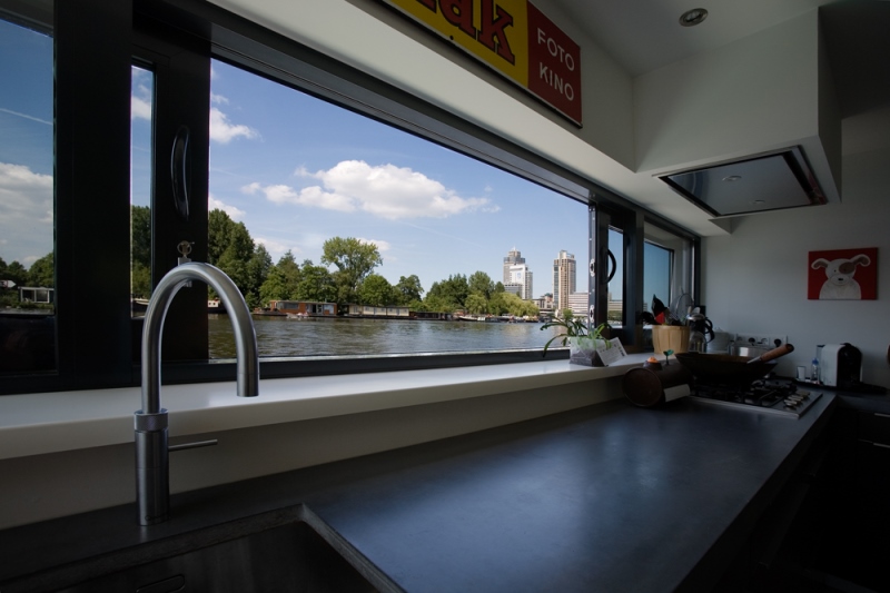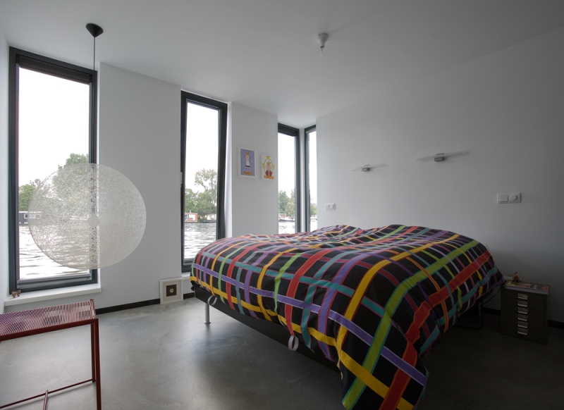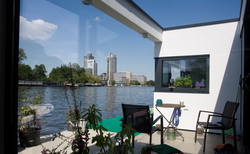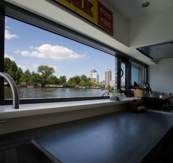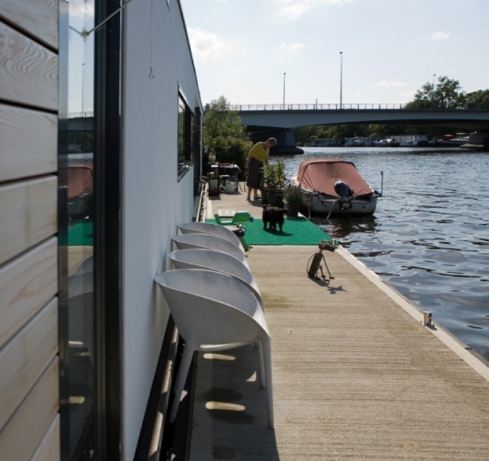 'Onze ark heeft 1 woonlaag met opslag eronder.' Op het inpandige terras, dat vrijwel altijd uit de wind ligt en op het drijvende terras, over de volle lengte van de ark, genieten Jan en Monique van het buiten wonen. De vensters, groot en klein, alles schuift of klapt open. Hierdoor is er ook binnen optimaal contact met het water. 'De betonnen vloer, door de hele ark, is gevlinderd en twee keer transparant gecoat. Lekker warm, dankzij de vloerverwarming. Alles in het ontwerp is rechthoekig, behalve een opvallende ronde hoek in de woonkamer en een net niet recht lopende binnenwand. De handtekeningen van Marc Seidl', vertelt Monique. Modern en strak, dat typeert het hele ontwerp. De gevel is een combinatie van wit stucwerk, onbehandeld Western Red Cedar en zwarte daklijsten. De kozijnen zijn van aluminium.