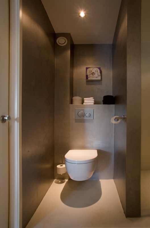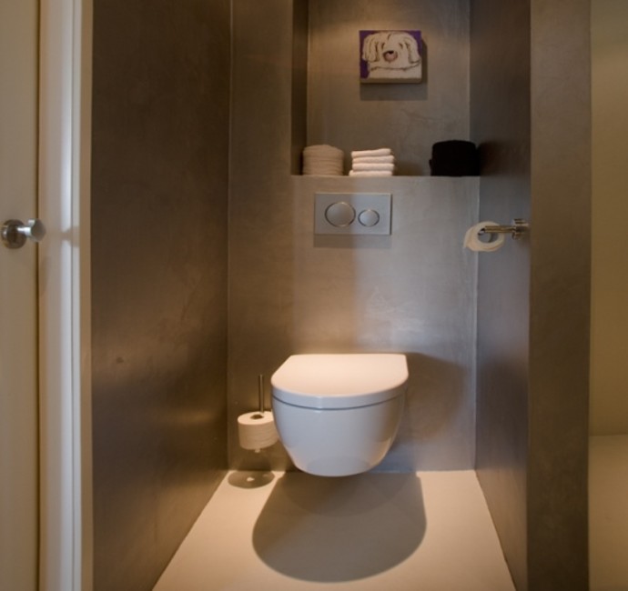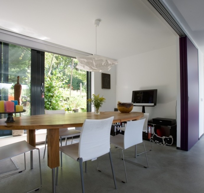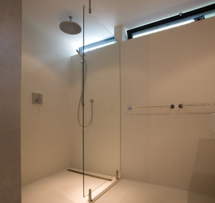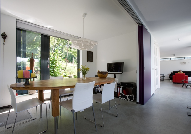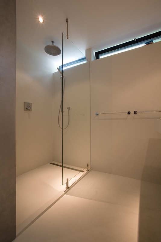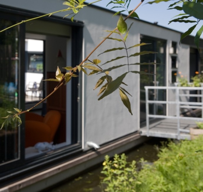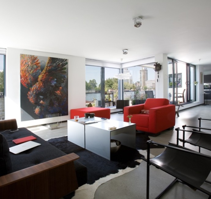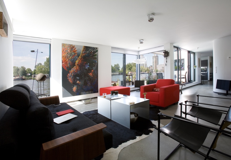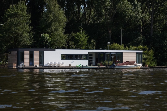 'Onze ark heeft 1 woonlaag met opslag eronder.' Op het inpandige terras, dat vrijwel altijd uit de wind ligt en op het drijvende terras, over de volle lengte van de ark, genieten Jan en Monique van het buiten wonen. De vensters, groot en klein, alles schuift of klapt open. Hierdoor is er ook binnen optimaal contact met het water. 'De betonnen vloer, door de hele ark, is gevlinderd en twee keer transparant gecoat. Lekker warm, dankzij de vloerverwarming. Alles in het ontwerp is rechthoekig, behalve een opvallende ronde hoek in de woonkamer en een net niet recht lopende binnenwand. De handtekeningen van Marc Seidl', vertelt Monique. Modern en strak, dat typeert het hele ontwerp. De gevel is een combinatie van wit stucwerk, onbehandeld Western Red Cedar en zwarte daklijsten. De kozijnen zijn van aluminium.