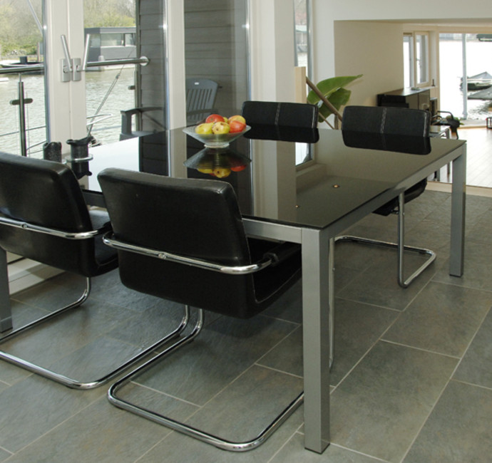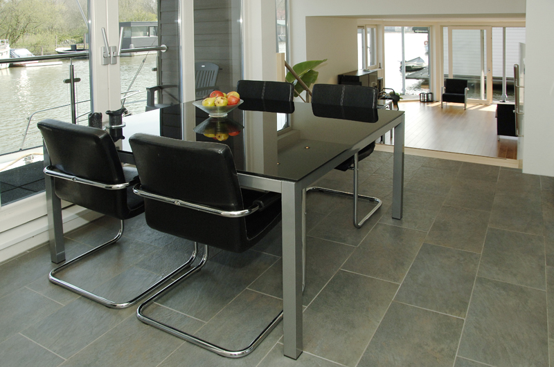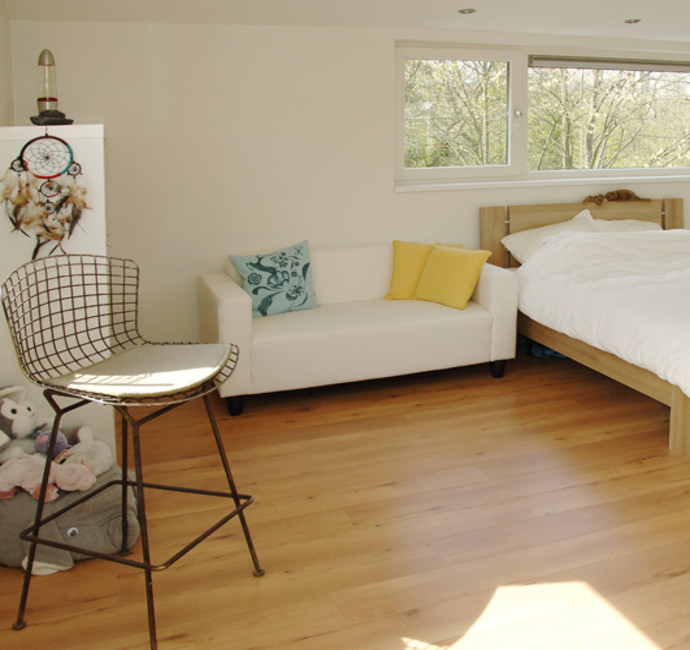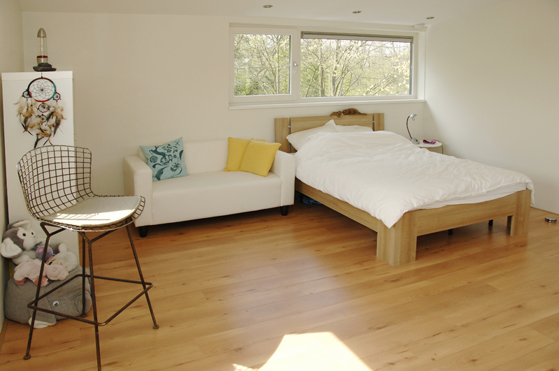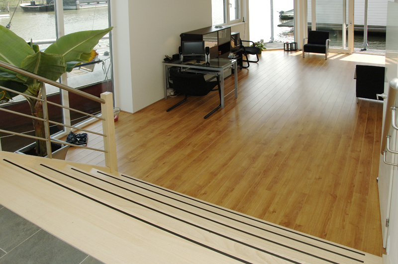 ‘Onze woonwensen zijn meer dan uitgekomen. Doordat we voor een ‘split-level’ kozen, is er niveauverschil tussen de huiskamer en de keuken. Dat pakt bijzonder mooi uit. Vooral door de mooie brede essenhouten trap. Wij hebben een balkon met schuifpui aan de keuken. Dit is een heel lekker plekje op het oosten, om in de zomer te ontbijten. Ook is er nog een overdekt terras op het zuiden. Het geeft veel openheid. Tijdens feestjes geeft het de jeugd de mogelijkheid om een hengeltje uit te gooien of om een barbecue op te tuigen.’