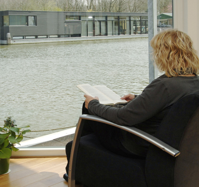 ‘We hebben een jaar of dertig in de romp van een loodskotter geleefd. Vochtig en koud in de winter. En klein. Optimistisch als we zijn noemden we het laatste knus. We dachten dat we de kotter erg zouden missen. Maar bij het afscheid van onze dierbare boot hadden we geen tranendoeken nodig. De nieuwe ark biedt zoveel meer, als uitzicht over het water, licht, ruimte en vloerverwarming. We verlangen beschamend weinig terug naar de goede oude tijd.