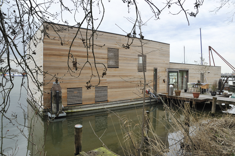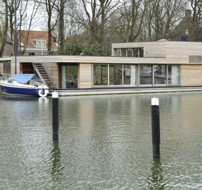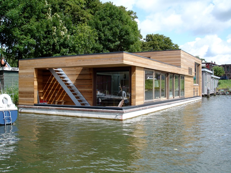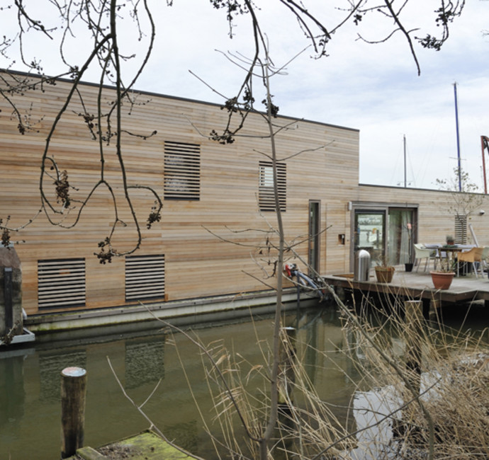 Verschillende terrassen, openingen naar alle richtingen en de natuurlijke materialen maken het verblijf op deze watervilla tot een natuurbelevenis. De sfeervolle boot meet 20m lang, 9m breed en 4,5m hoog. Het gevelmateriaal is Red Cedar, met Padoek houten kozijnen. Het gebruiksoppervlak is ca. 175m2.