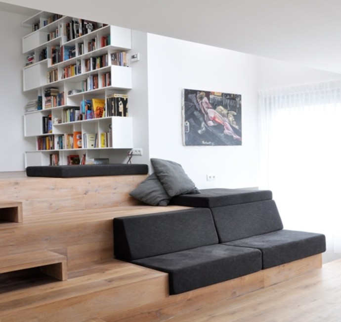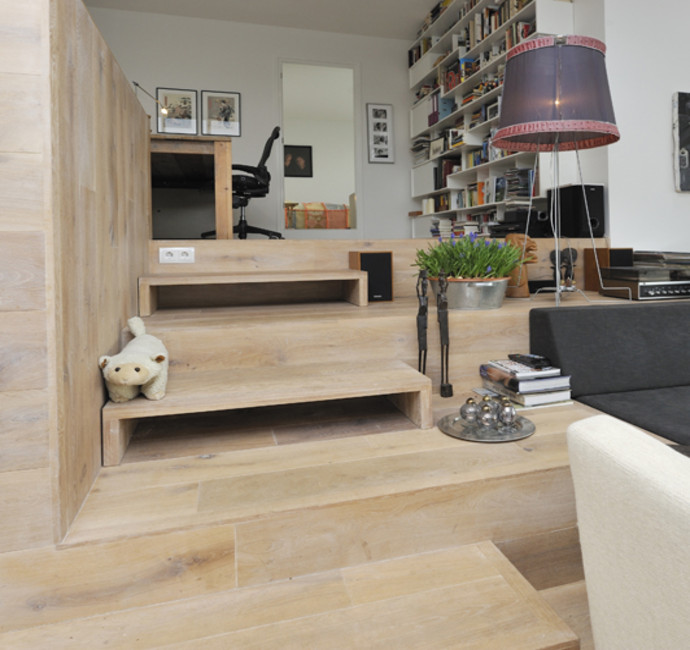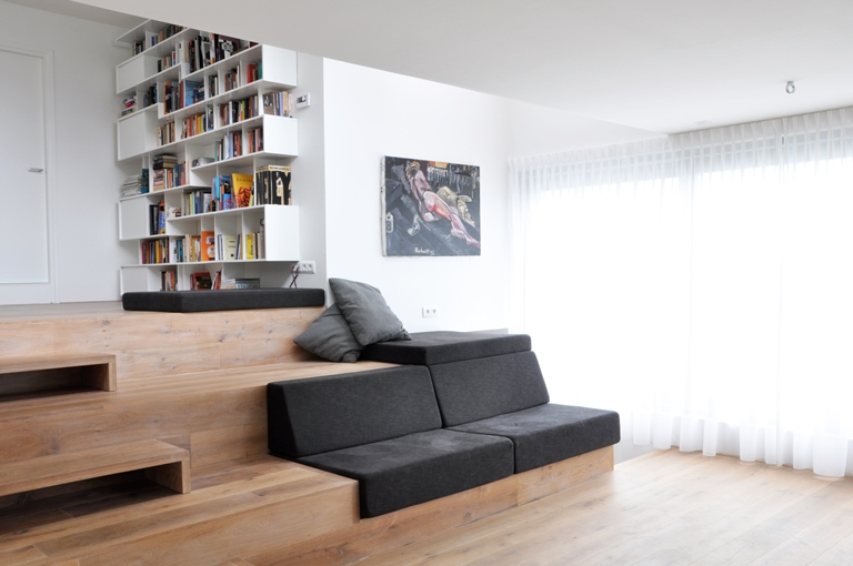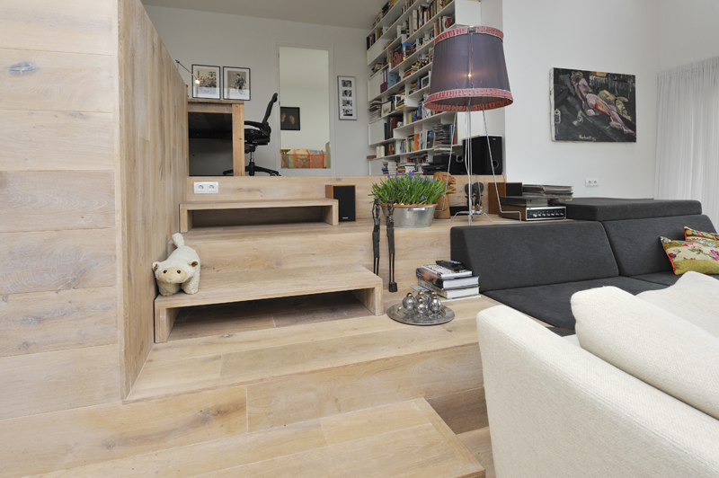 Architect Thomas Durner nam het heft in handen en creëerde een open sfeer met 7 verschillende niveaus, met deels 2 woonlagen en een mix van materialen.