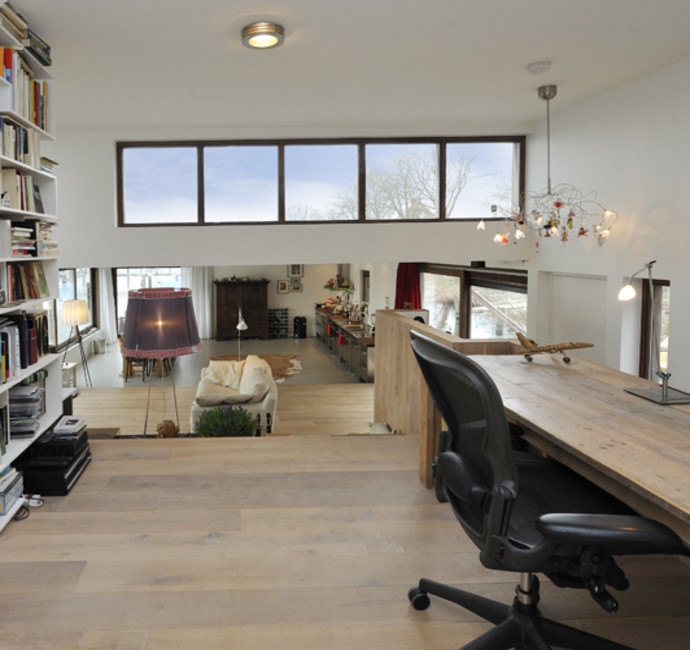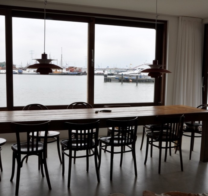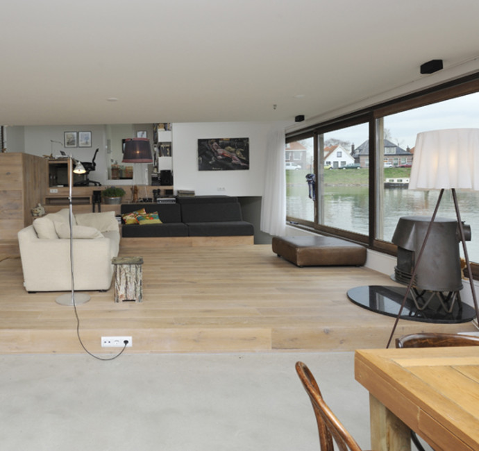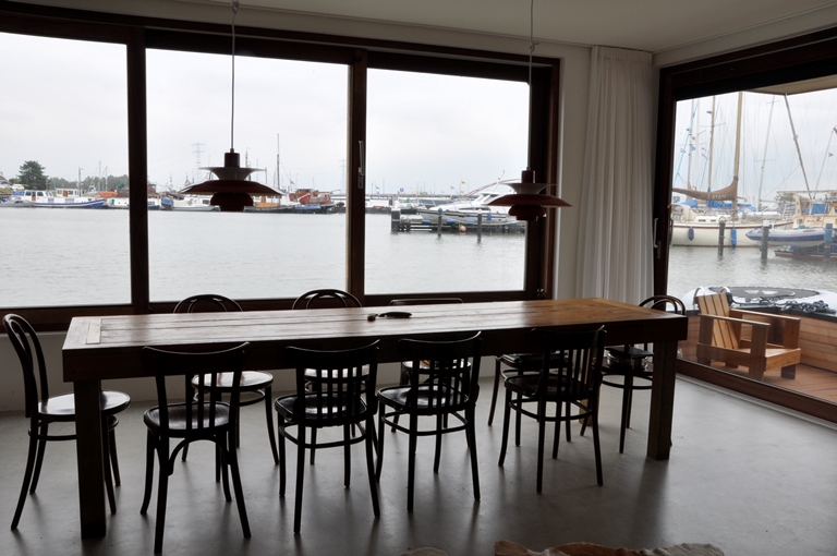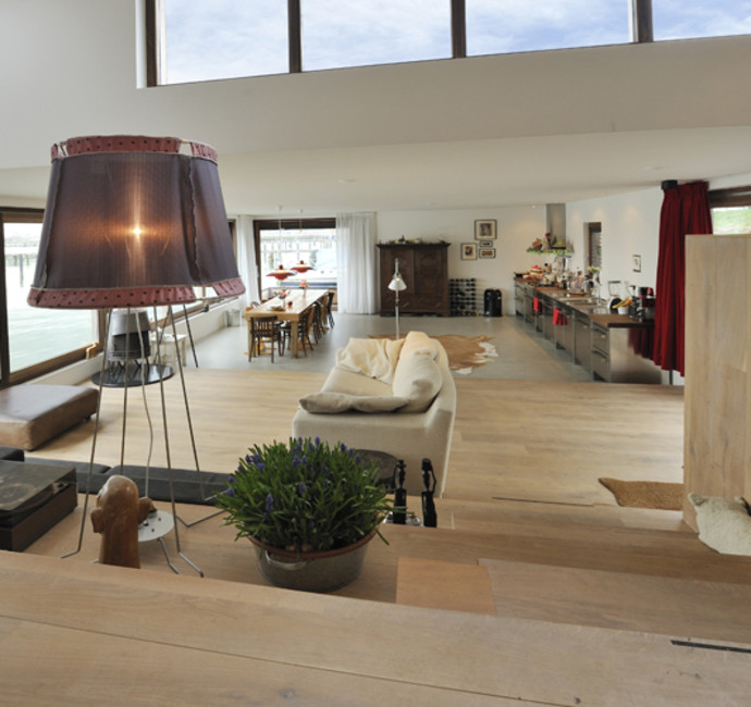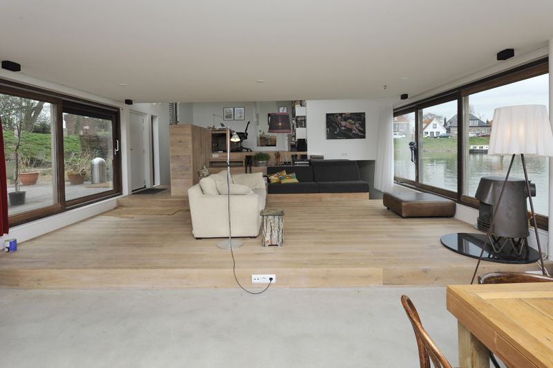 De 10 meter brede glasgevel kan tot tweederde worden geopend en maakt het watergenot compleet. De afwisseling van de beton-, hout- en gietvloeren (met overal vloerverwarming) en de diverse doorkijkjes geven een speels karakter.