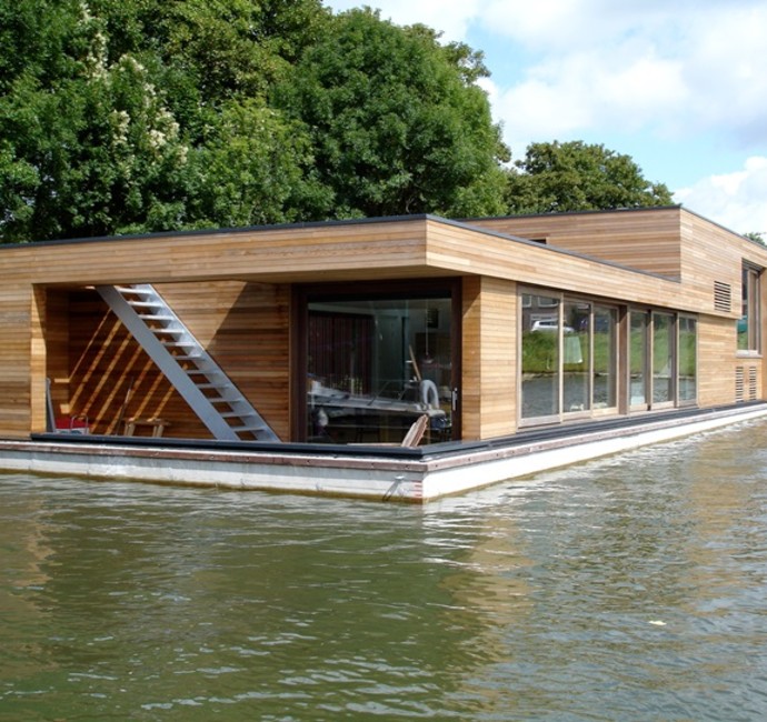 Het resultaat is een drijvend huis dat op veel verschillende manieren contact maakt met het water en de omringende locatie.