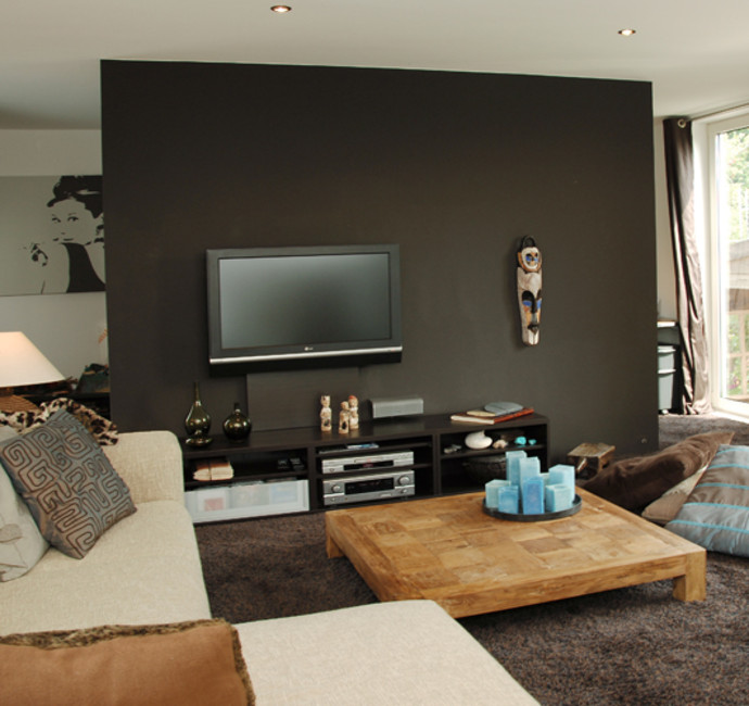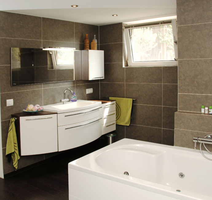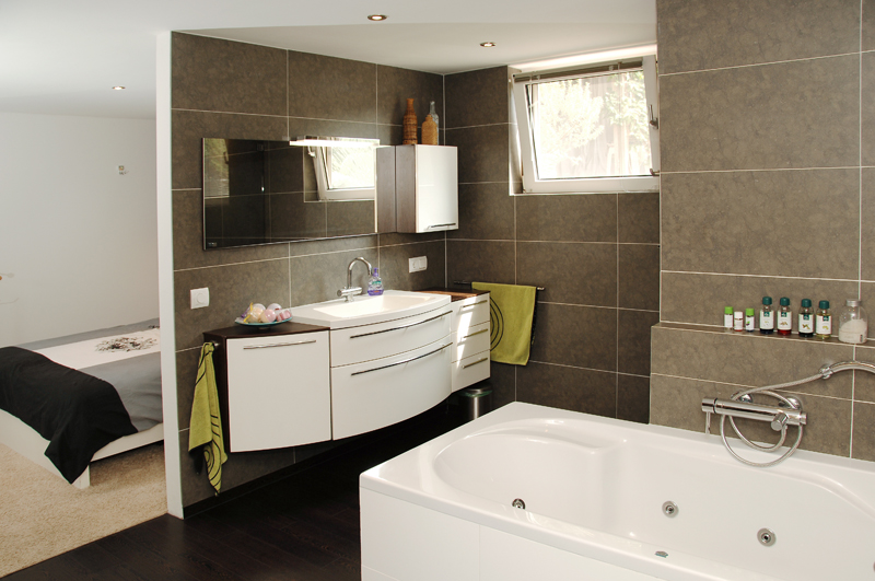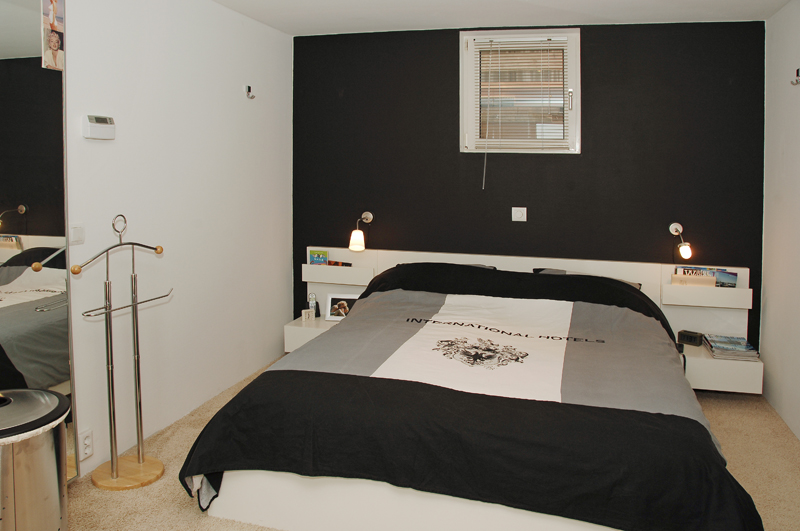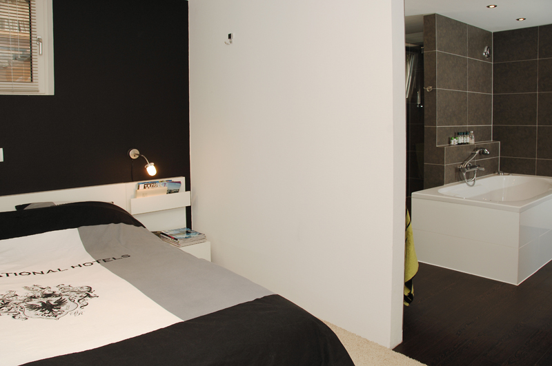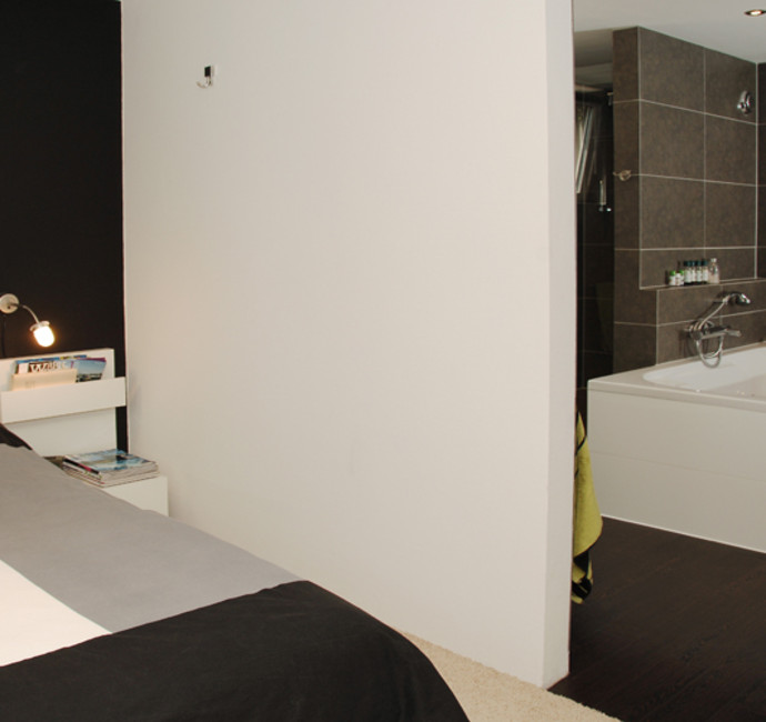 De gecombineerde slaap- en badkamer zijn gescheiden door een tussenmuur. Optisch zorgt dit voor meer ruimte en geeft tegelijkertijd de nodige privacy. Zwart, wit en antracietgrijs zijn de kleuren die in beide ruimtes zijn gebruikt. Hierdoor is het een rustig geheel geworden.