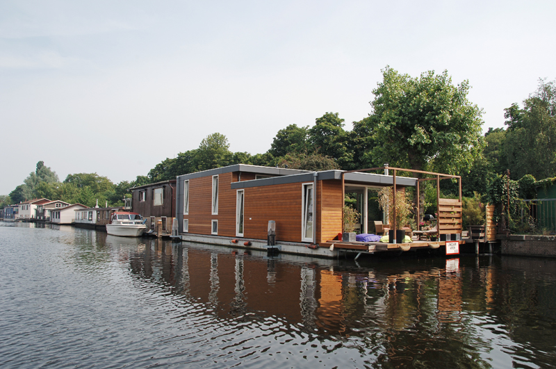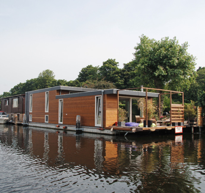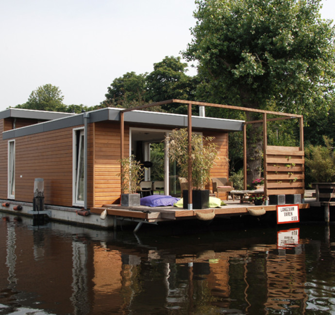 Comfortabel, open, praktisch en prettig wonen waren de uitgangspunten bij het ontwerp van Jacqueline Lissenburg en Ed van de Pas. De ligplek aan het Vredenhofpad in Amsterdam heeft een heerlijke tuin, aan één zijde buren en de andere zijde een vrij uitzicht.