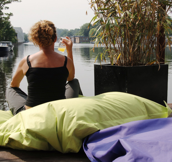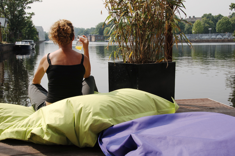 De woonkeuken wordt nog eens extra verlengd door het terras op het water. ‘Hier genieten we vanuit onze luie stoel en zitkussens van het vrije uitzicht’.
