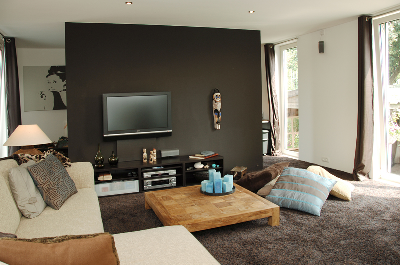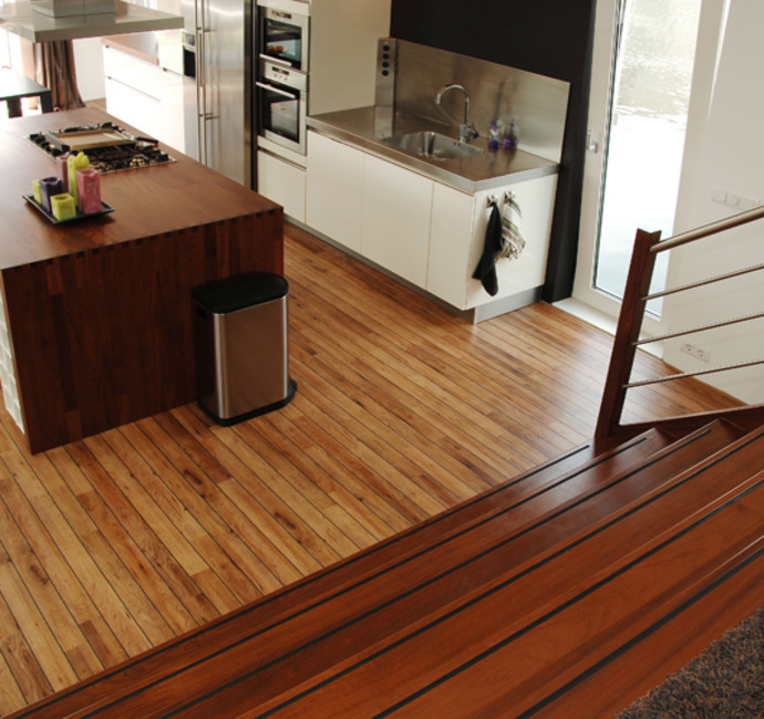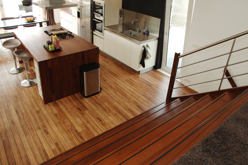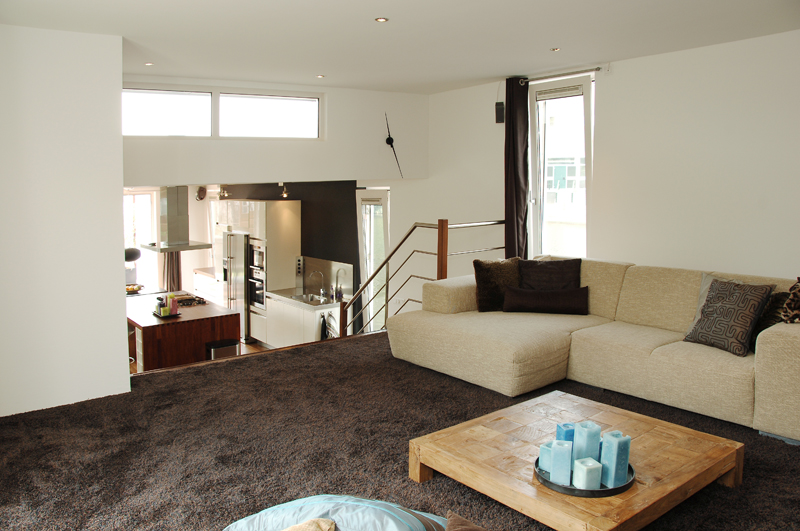 ‘Heerlijk vinden we de grote leefkeuken. Vanachter het kookeiland kijk je via de beide schuifpuien naar de tuin, het terras en heb je contact met de woonkamer’. Door de prachtige brede houten trap bereik je de comfortabele zitkamer. Hier is een muur als ruimteverdeler geplaatst. achter deze muur, die aan beide zijden open is, bevindt zich de werkkamer.