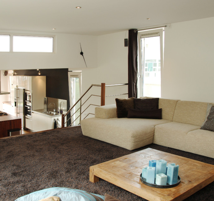 De splitlevel is 16,5 m lang x 5,5 m breed en heeft een hoogte van 4,5 m boven de waterlijn. er is hierdoor veel ruimte gecreëerd. Vanuit de woonkeuken is het maar een paar treden omhoog naar de zitkamer en met een andere trap via een paar treden omlaag naar de slaapverdieping.