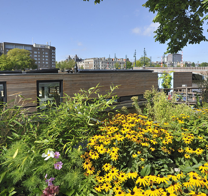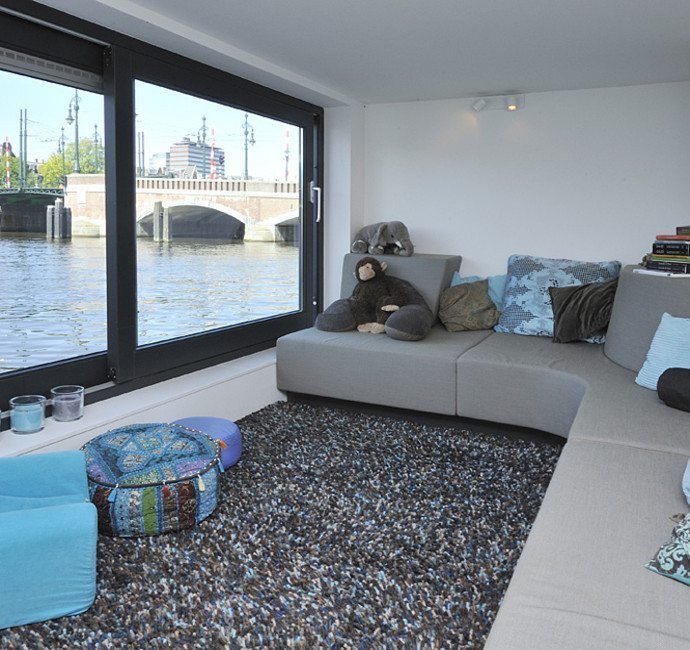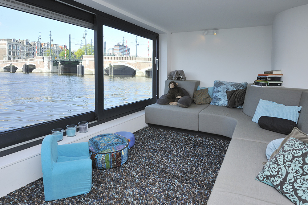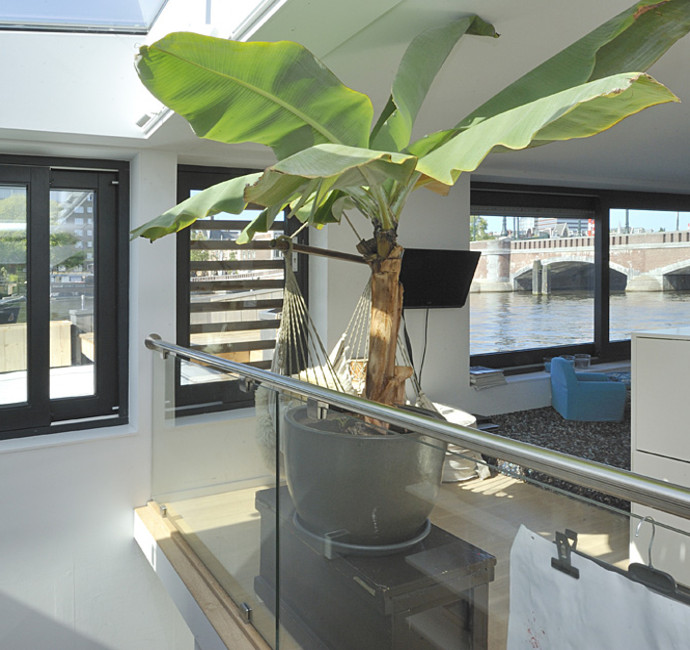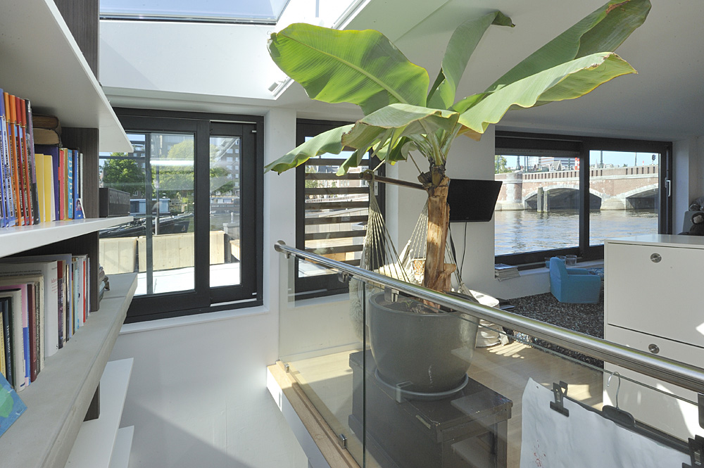 De eigenaren van deze woonark willen niets missen van de Amstel. En zeg eens eerlijk, dat zou u toch ook niet willen als dit plekje aan u zou toebehoren? Naast de vele ramen waarmee je alle kanten uit kan kijken en veel contact voelt met het water, zijn er in het dak dakramen geplaatst.