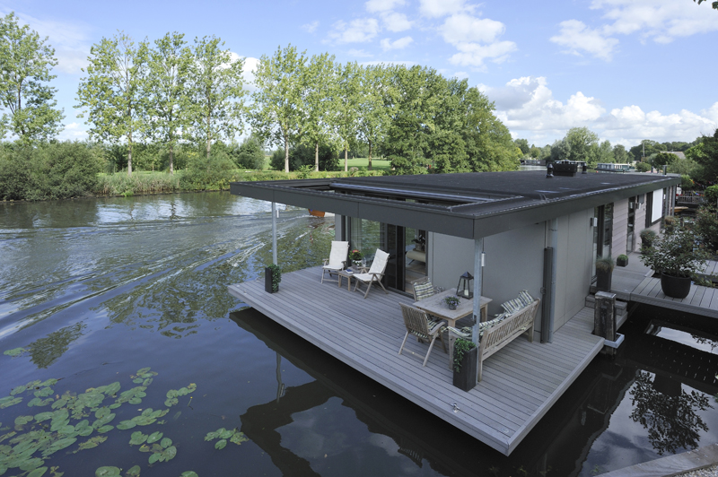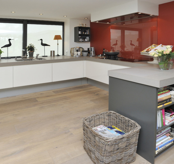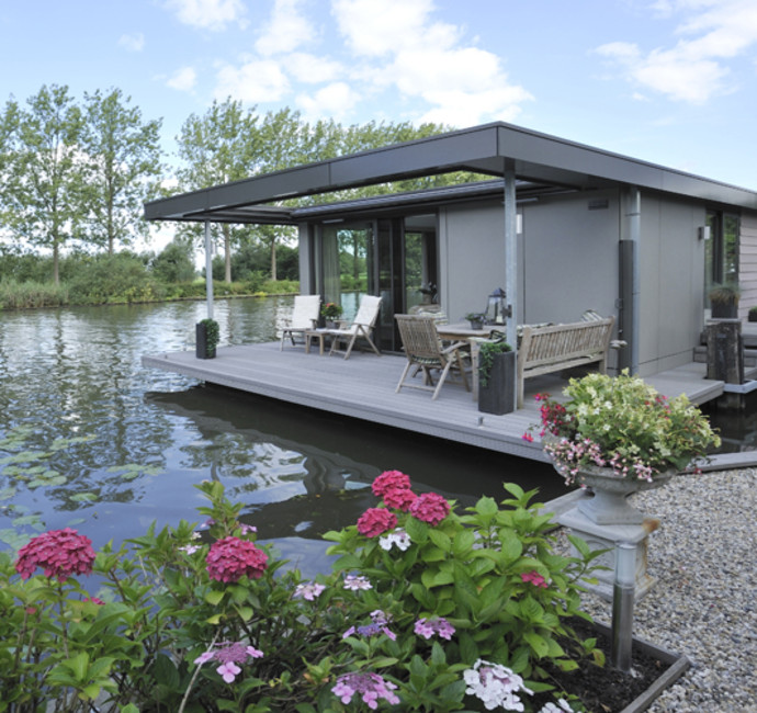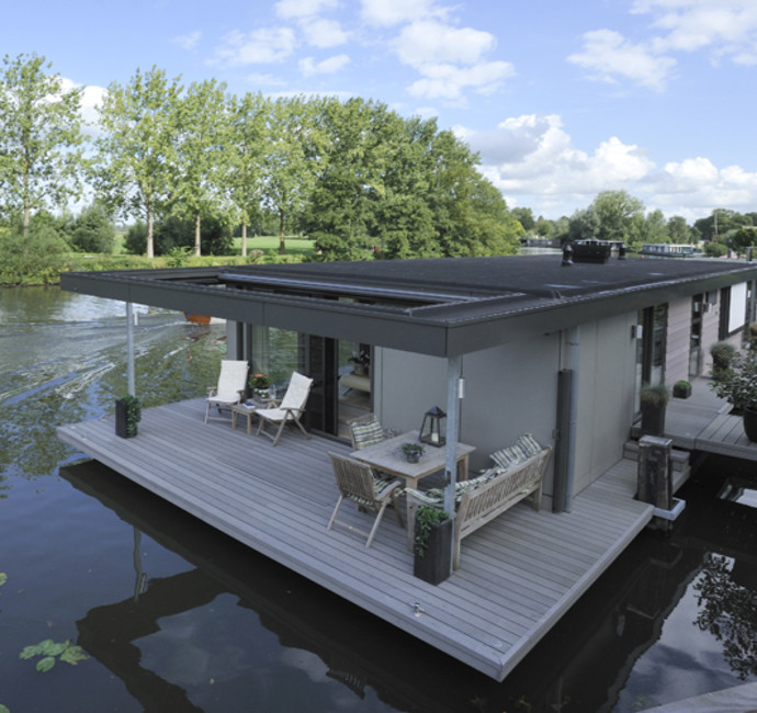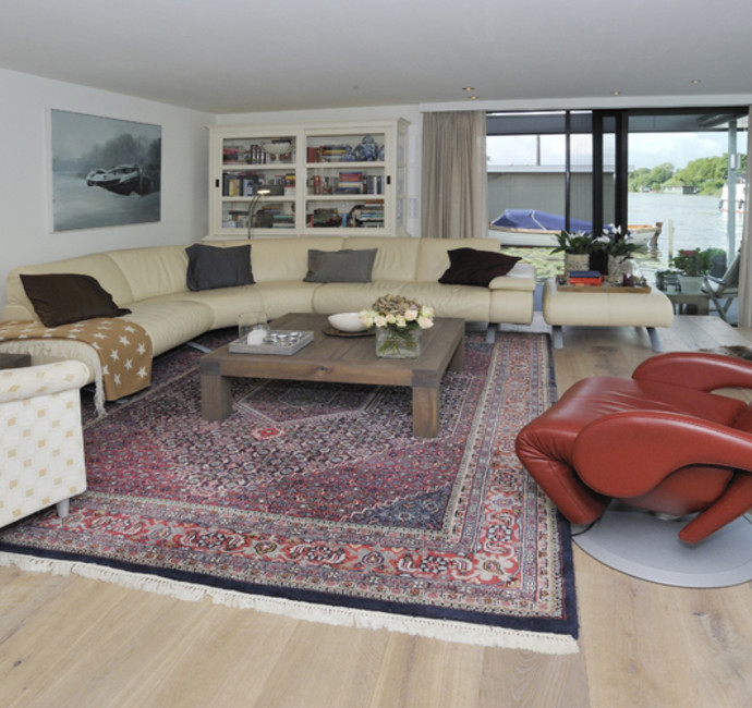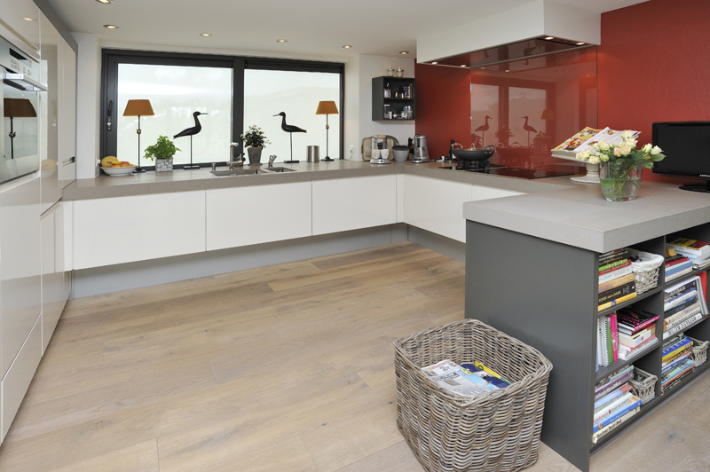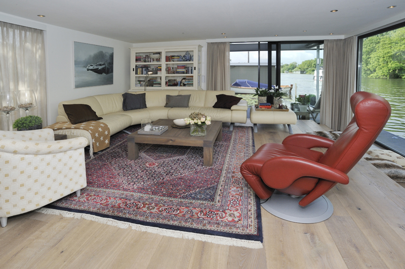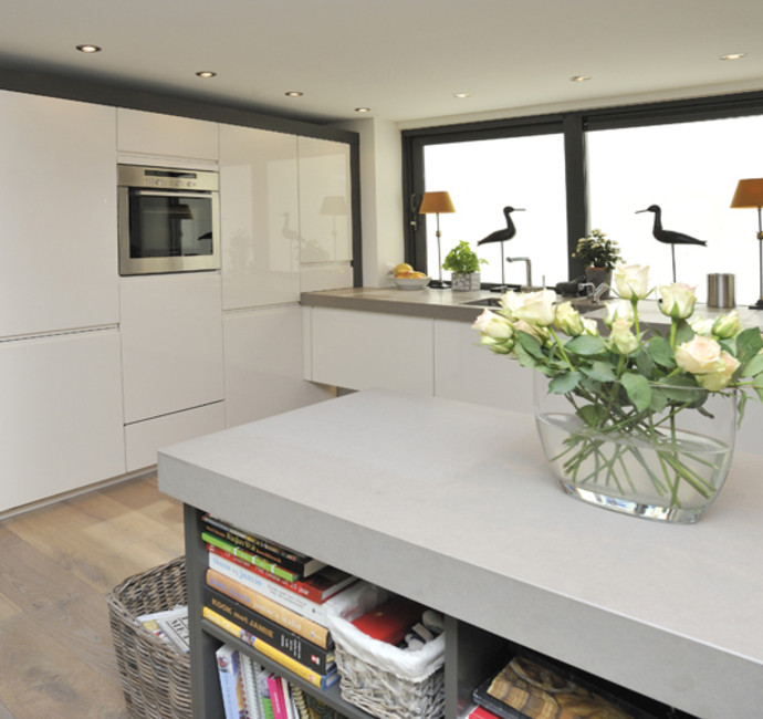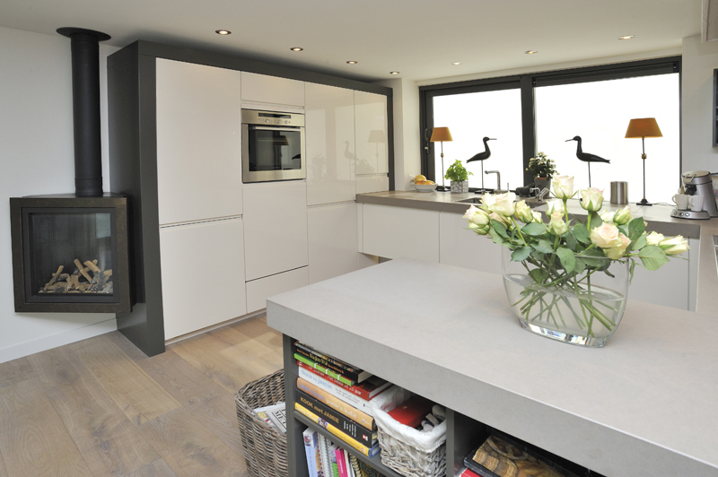 In onze woonark wilden we alle seizoenen genieten van het ‘buiten’. Daarom wilden wij veel, heel veel glas... rondom, zodat buiten ook naar binnen komt. Onze smaak? Strak, rustig en modern. De woonark is 18 meter geworden. De door de gemeente aangegeven maximale hoogte beperkte ons erg in het streven naar het contact houden met het water en tegelijkertijd het ruimtelijke gevoel binnen. De vloer voor de schuifpuien hebben we toen verlaagd. Daardoor konden grote ramen in de woonkamer geplaatst worden wat een heel ruimtelijk effect binnen geeft. De woonkamer grenst aan de open keuken. Achter de keuken ligt het kantoor.
