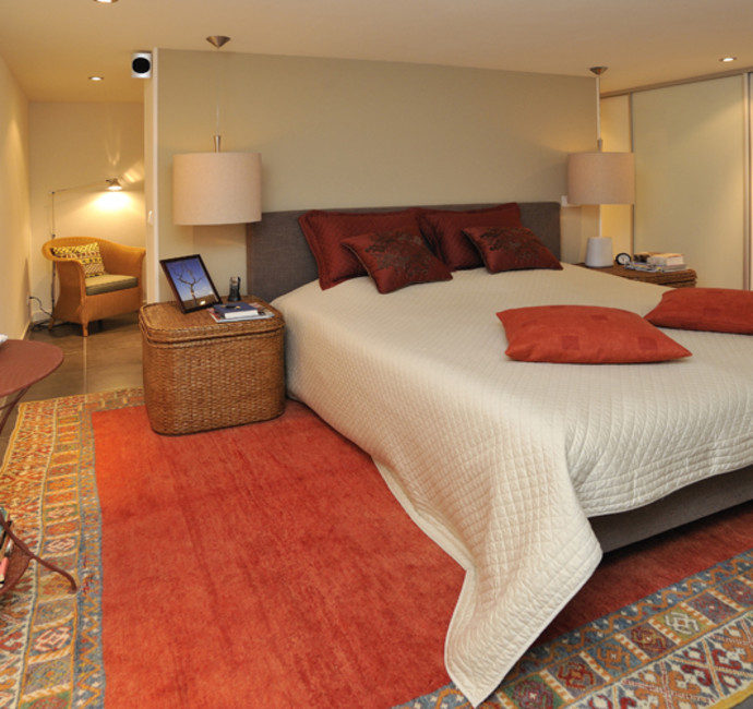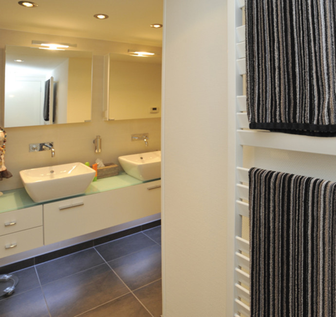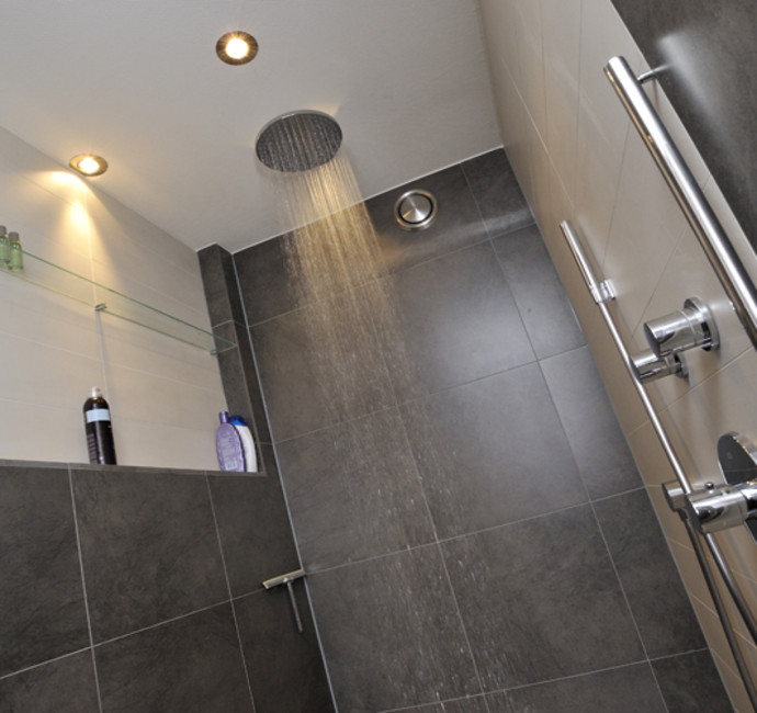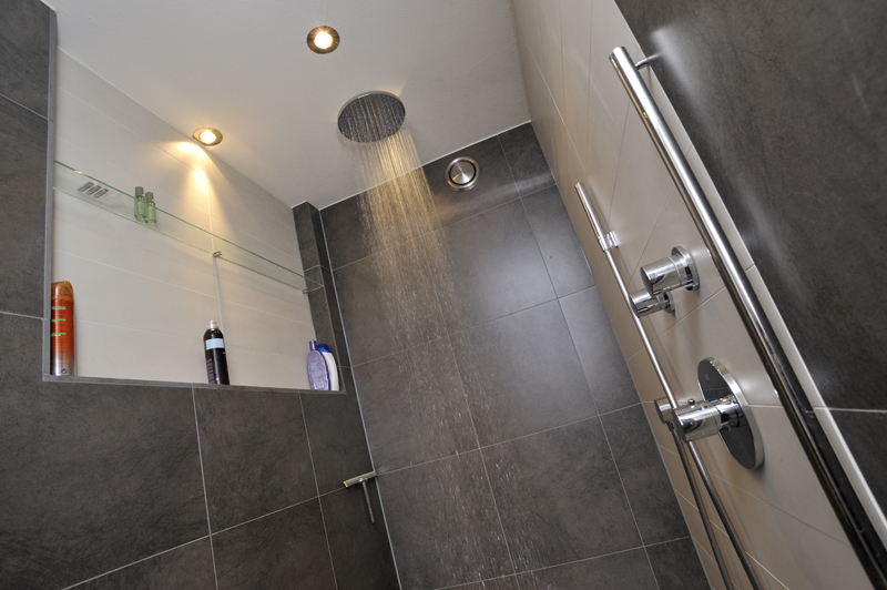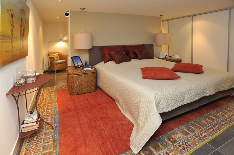 ‘In ons ’eigen gedeelte’ beneden (met grote slaapkamer, dubbele douche, toilet en inloopkast) hebben we zo min mogelijk deuren laten plaatsen. Een bijkomend voordeel van het verlagen van de verdiepingsvloer in de woonkamer is, dat we hieronder een inbouwkast hebben gecreëerd’. Mooi en praktisch; het verlaagde stuk is hierdoor onzichtbaar. Ook praktisch is dat we via dit gedeelte toegang hebben tot de berging onder het buitenterras.