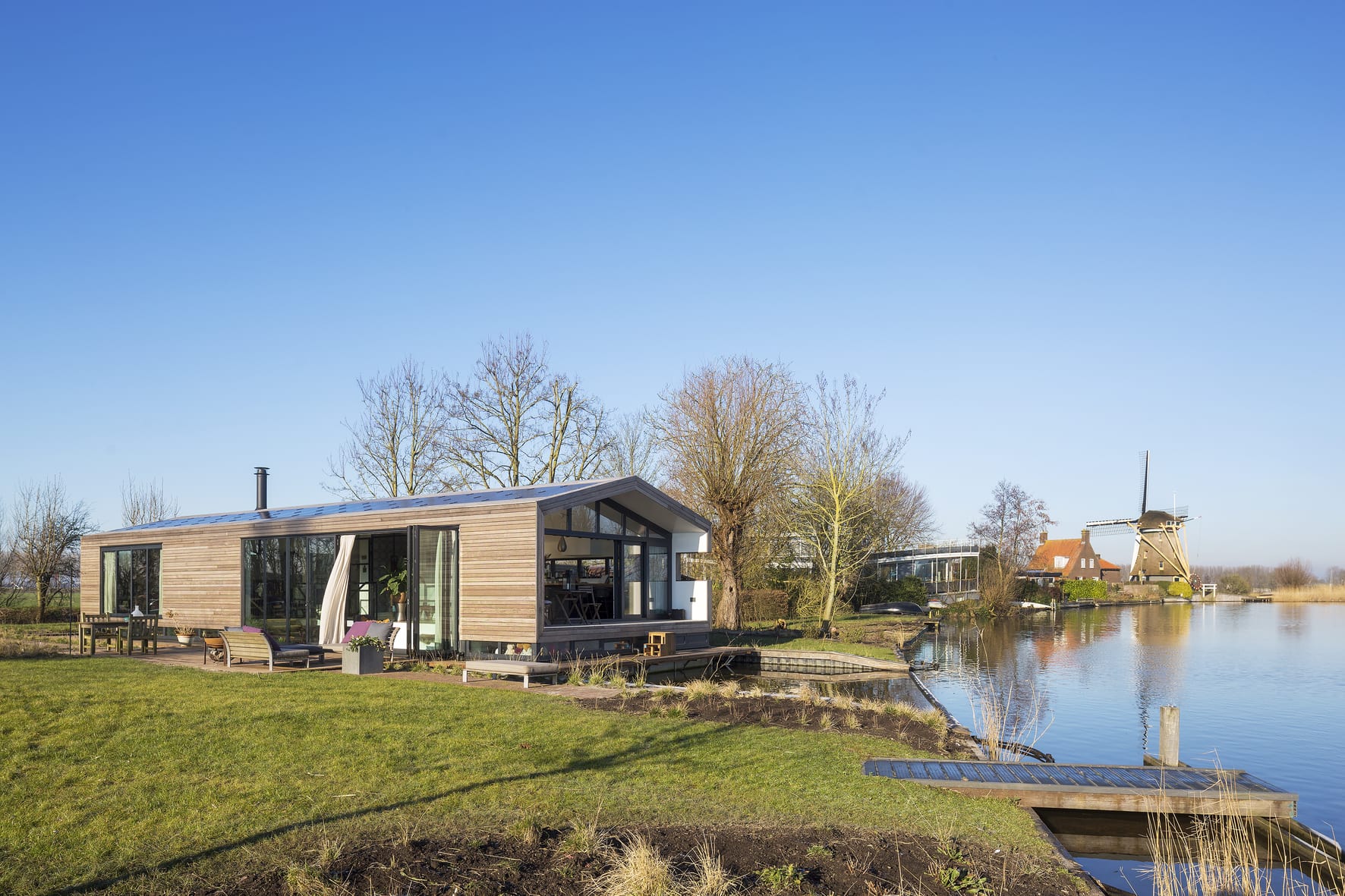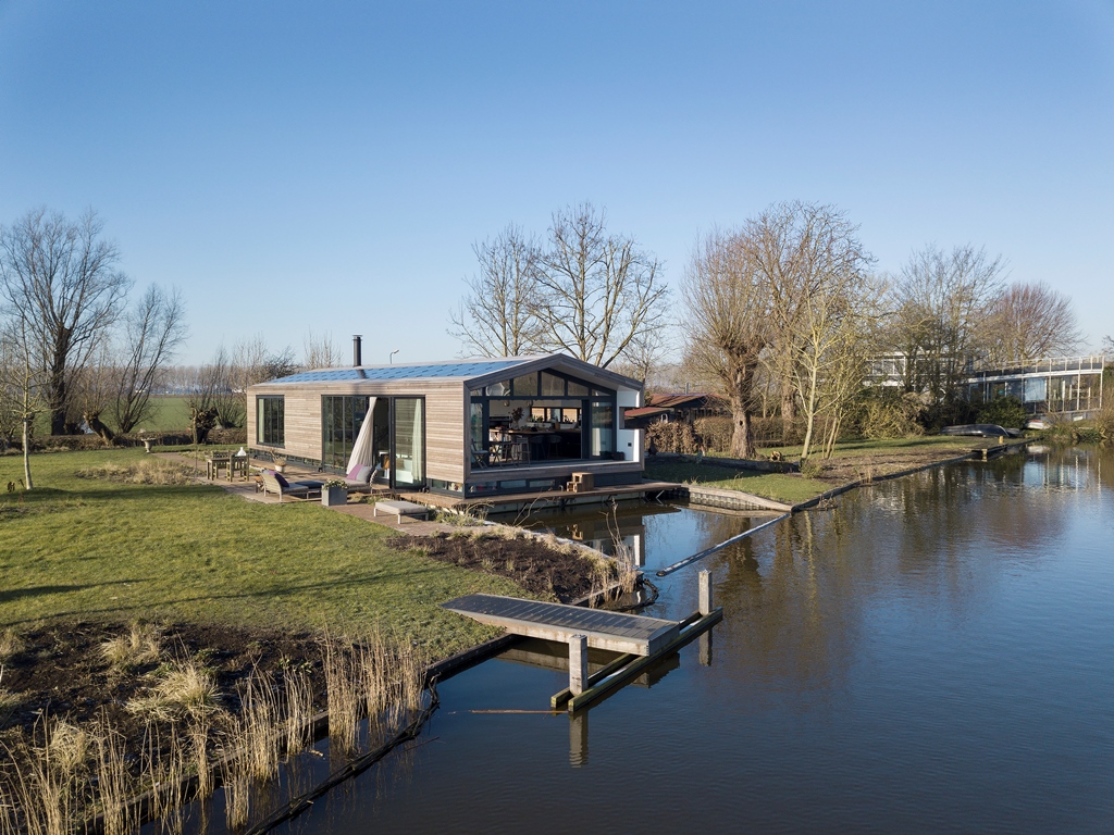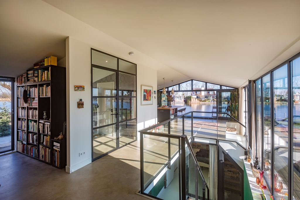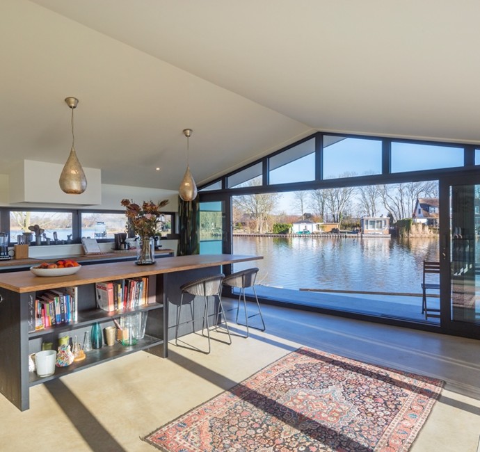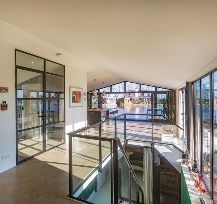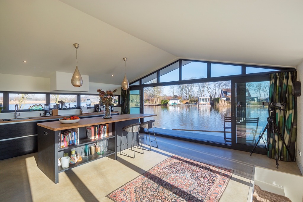 Architect Bob Ronday realiseerde op de bovenverdieping een tribune die door een grote harmonica schuifwand de verbinding met de tuin en het water vormt. In de woonkeuken zijn de keukenramen zó geplaatst dat de oer-Hollandse molen even verderop, altijd zichtbaar is. Zo zijn binnen en buiten naadloos met elkaar verbonden.