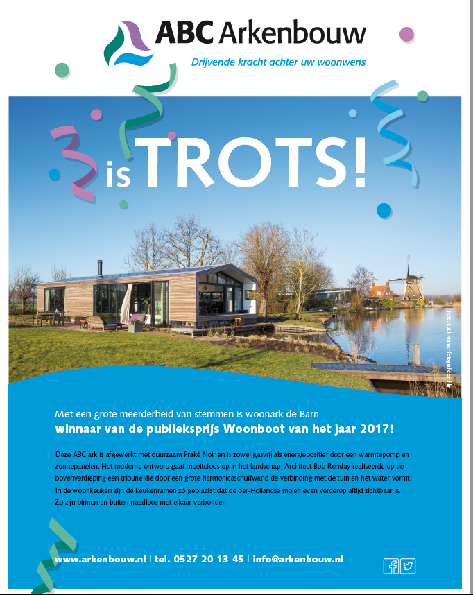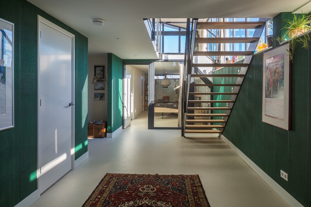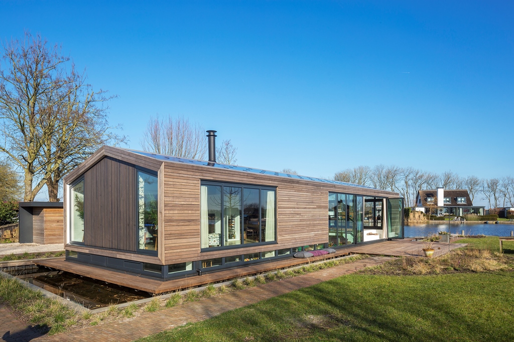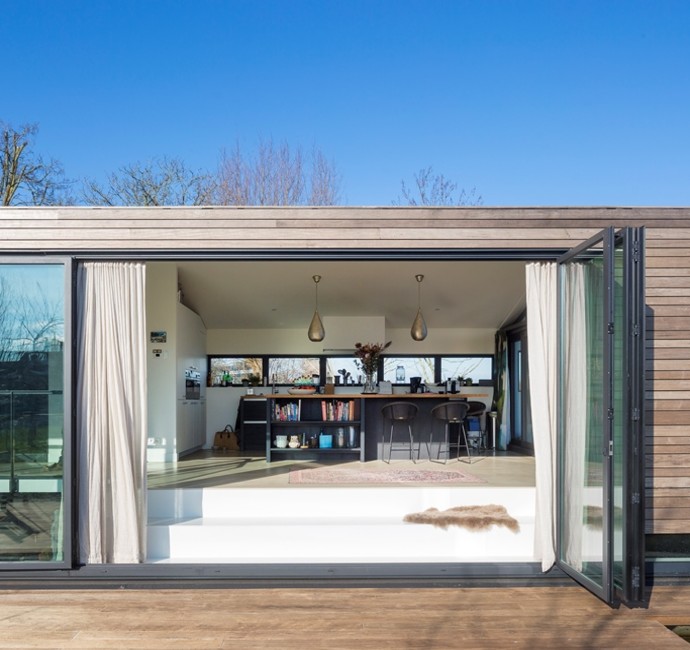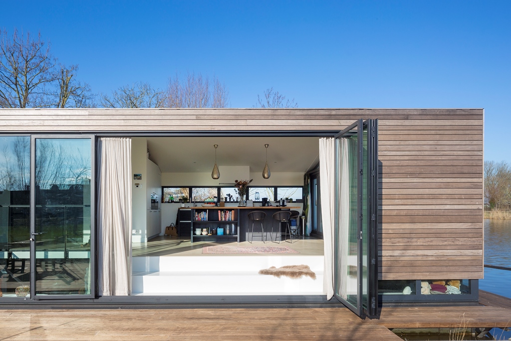 Architect Bob Ronday realiseerde op de bovenverdieping een tribune die door een grote harmonica schuifwand de verbinding met de tuin en het water vormt. In de woonkeuken zijn de keukenramen zó geplaatst dat de oer-Hollandse molen even verderop, altijd zichtbaar is. Zo zijn binnen en buiten naadloos met elkaar verbonden.