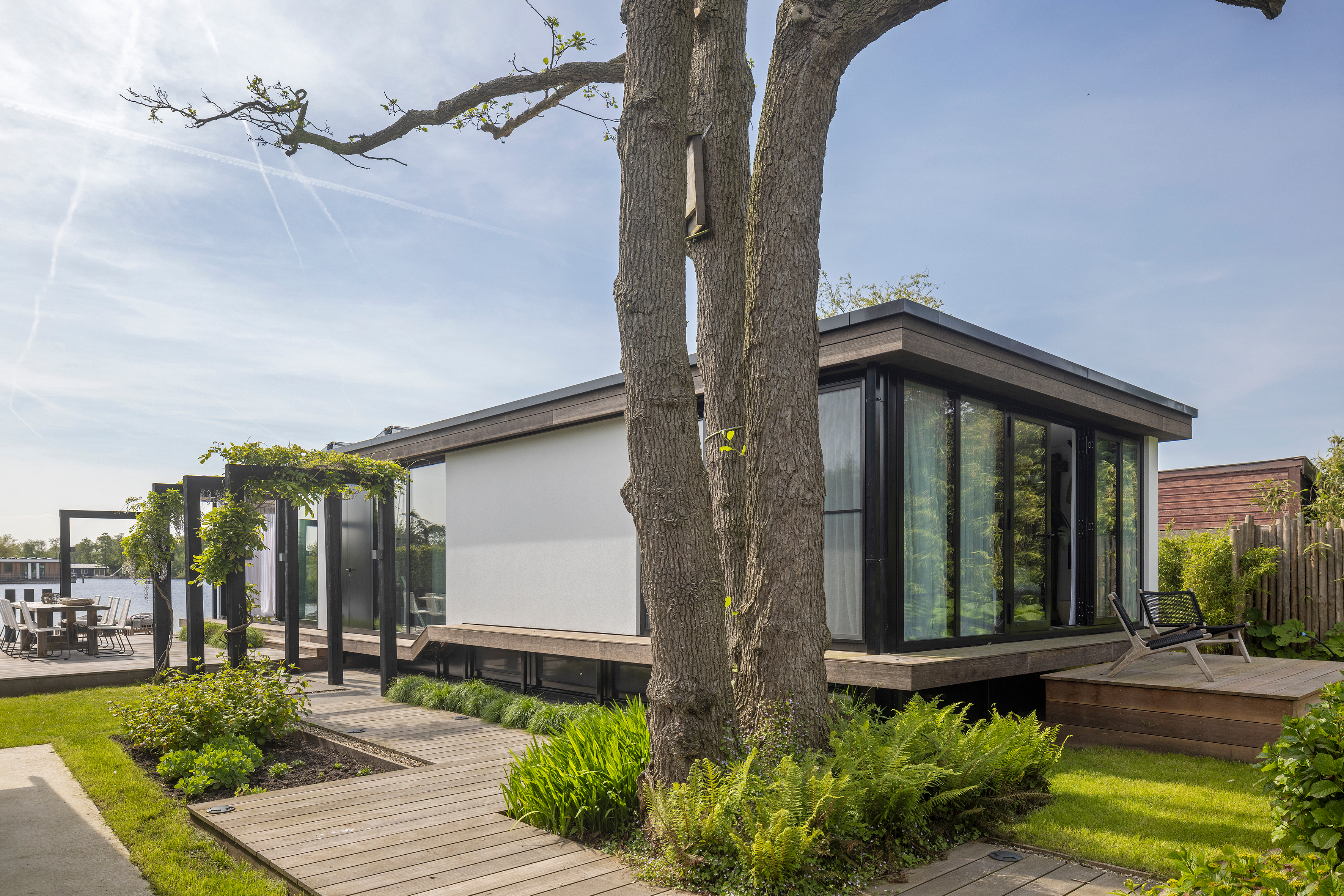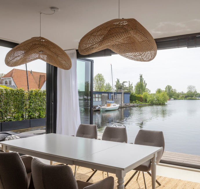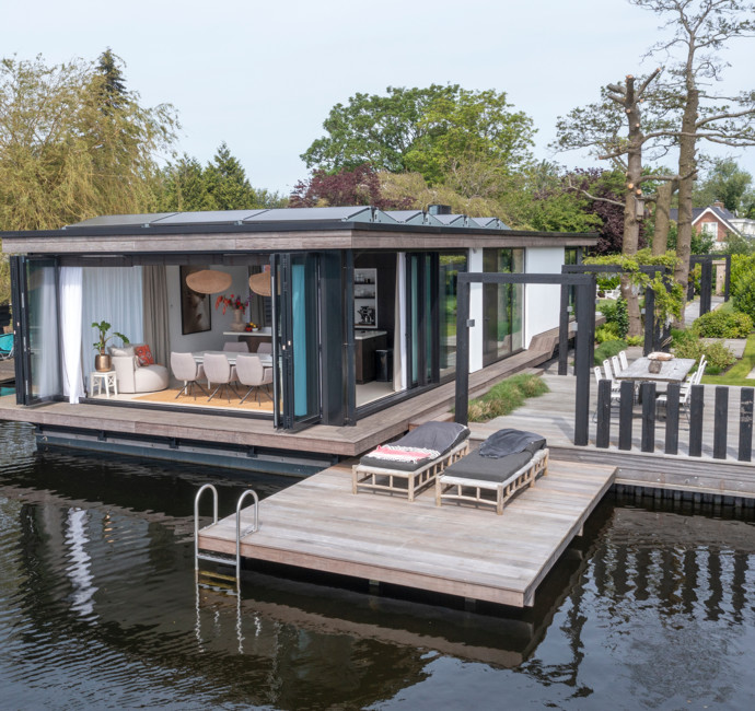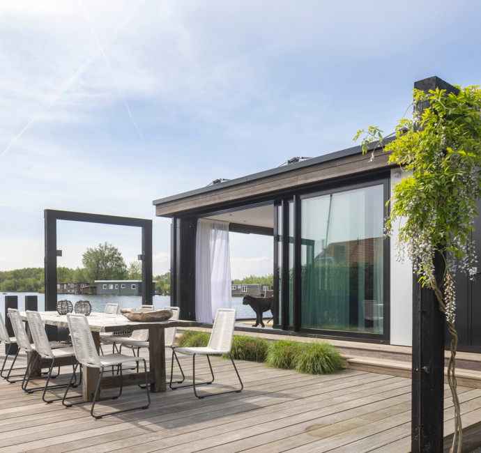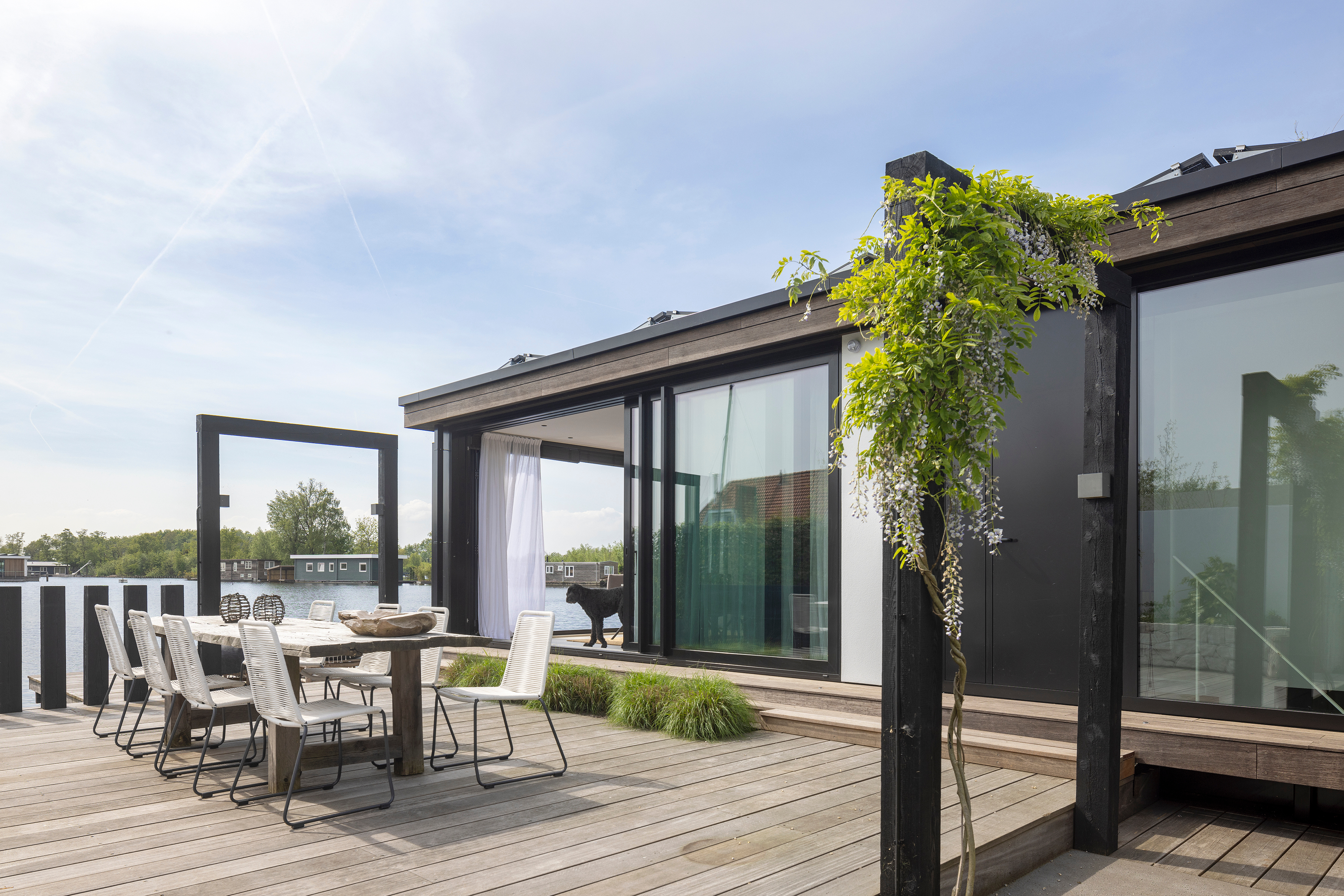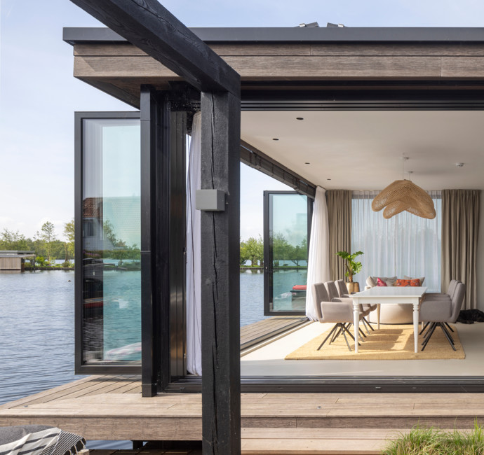 “Binnen en buiten loopt bij deze twee-laagse recreatiewoonark naadloos in elkaar over. De grote gevelopeningen zijn voorzien van schuif- en vouwpuien, waardoor er optimaal van de omgeving kan worden genoten. De keuken ligt op het lage deel van de splitlevel vloer en biedt het belangrijkste aspect van een drijvende woning: contact met het water.”