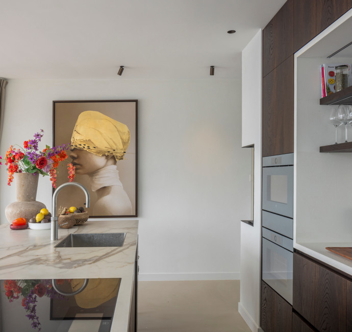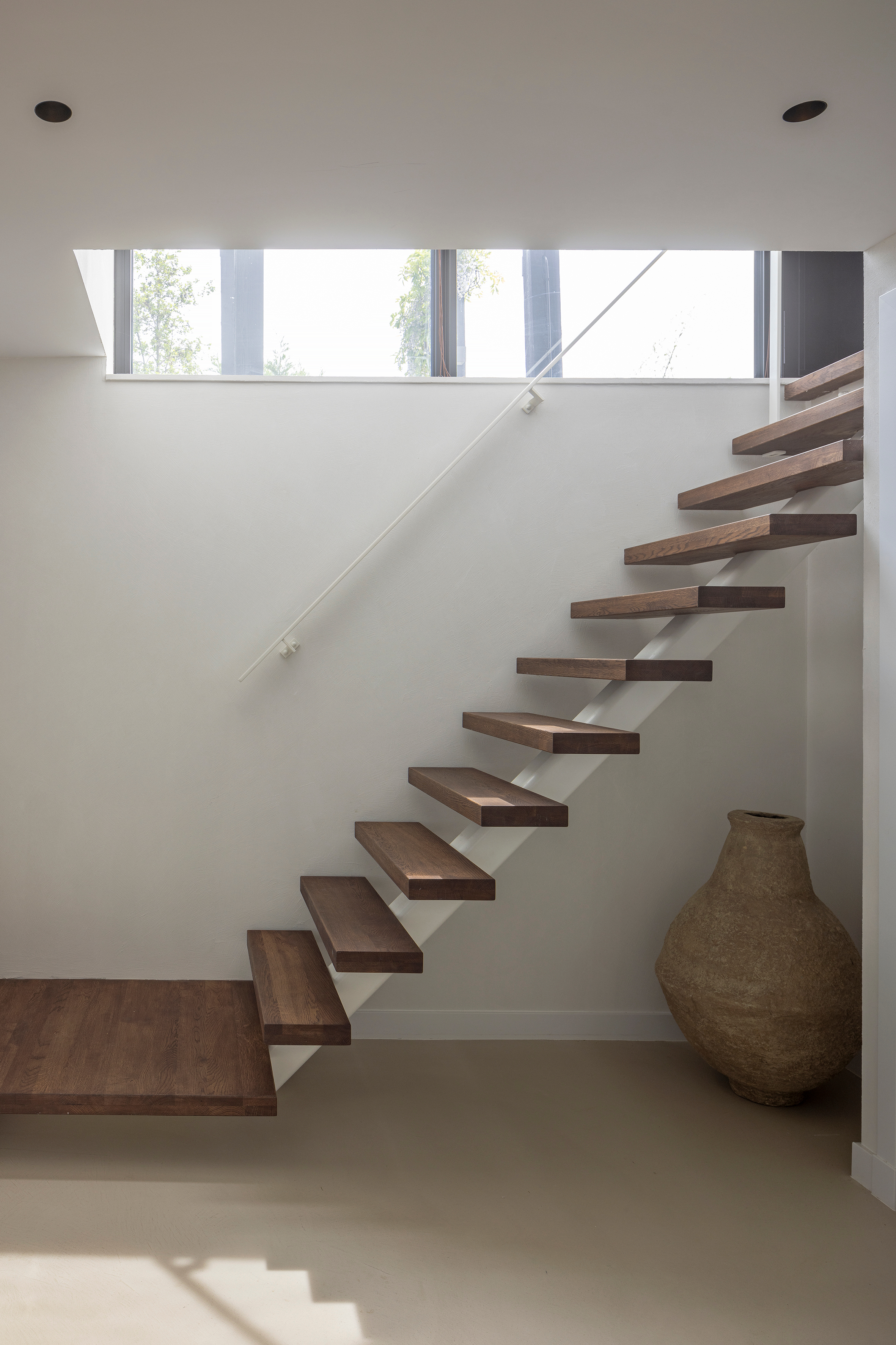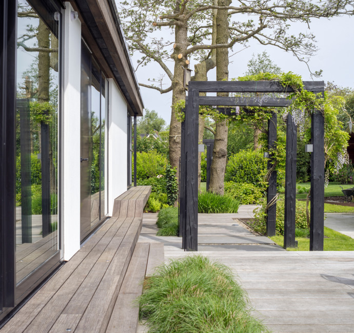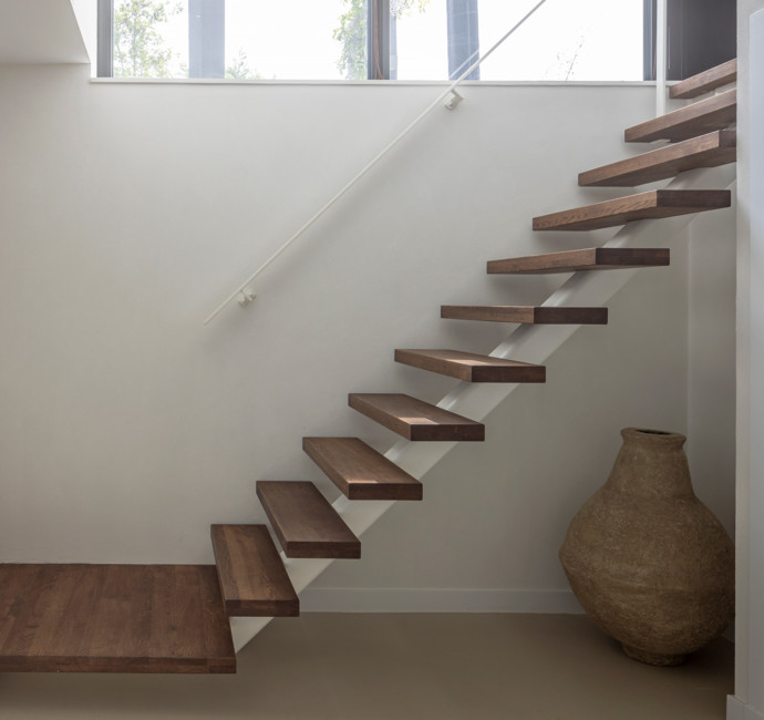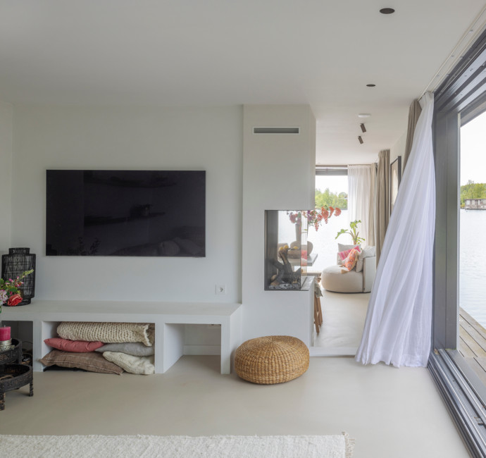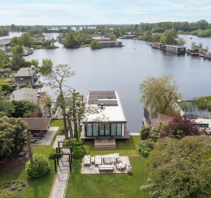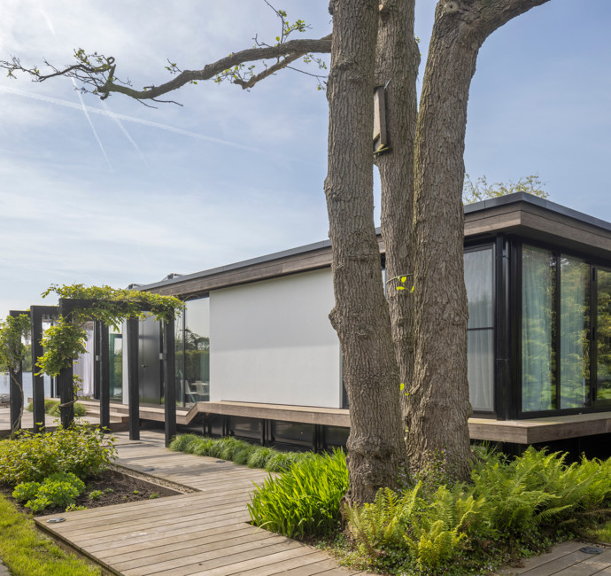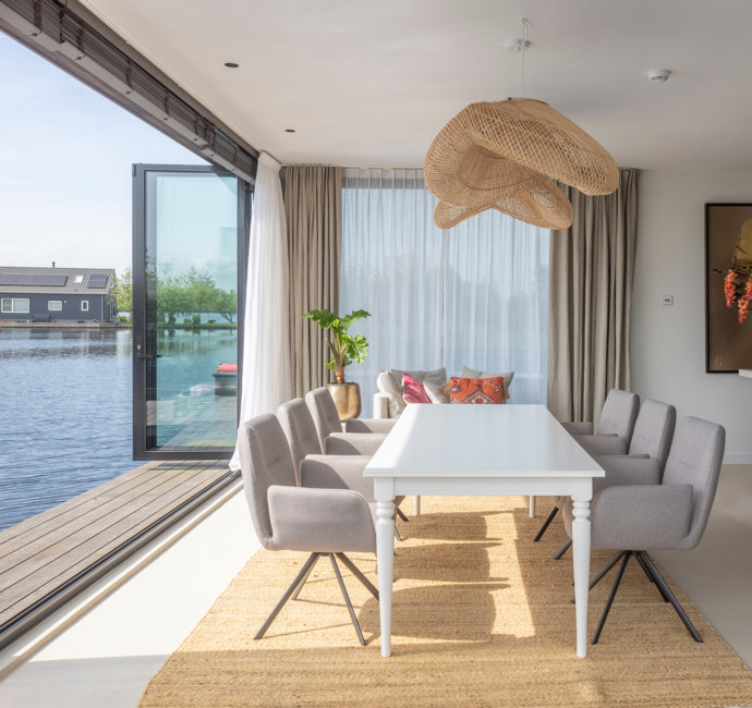 “Binnen en buiten loopt bij deze twee-laagse recreatiewoonark naadloos in elkaar over. De grote gevelopeningen zijn voorzien van schuif- en vouwpuien, waardoor er optimaal van de omgeving kan worden genoten. De keuken ligt op het lage deel van de splitlevel vloer en biedt het belangrijkste aspect van een drijvende woning: contact met het water.”