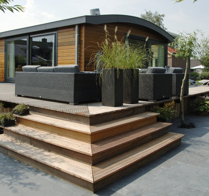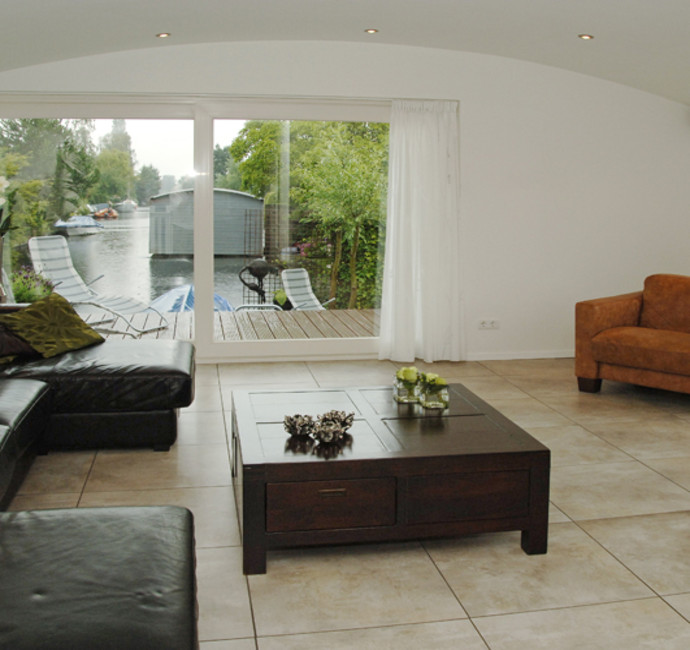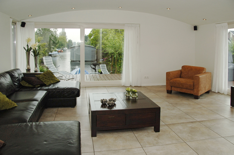 De mooie, degelijk gebouwde ark is geschikt voor vier volwassenen. De woonkamer is gescheiden van de eetkamer. Hier wilden we de raampartijen en schuifpuien zoveel mogelijk geplaatst hebben, waardoor we zo naar ons royale terras kunnen lopen. We vonden het belangrijk dat binnen en buiten één geheel vormden. De ruime open keuken is naast heel mooi ook praktisch en tijdloos. Ook kwamen er twee aparte badkamers en drie slaapkamers. Peter heeft ook nog een aantal bouwwerkzaamheden bij ABC zelf gedaan. ‘Handig, met wat extra handen van de mensen van ABC. Het was heel prettig dat tijdens de bouw onvoorziene problemen flexibel en naar tevredenheid opgelost werden. We kijken met veel plezier terug op de bouw en zijn erg tevreden over de samenwerking.’