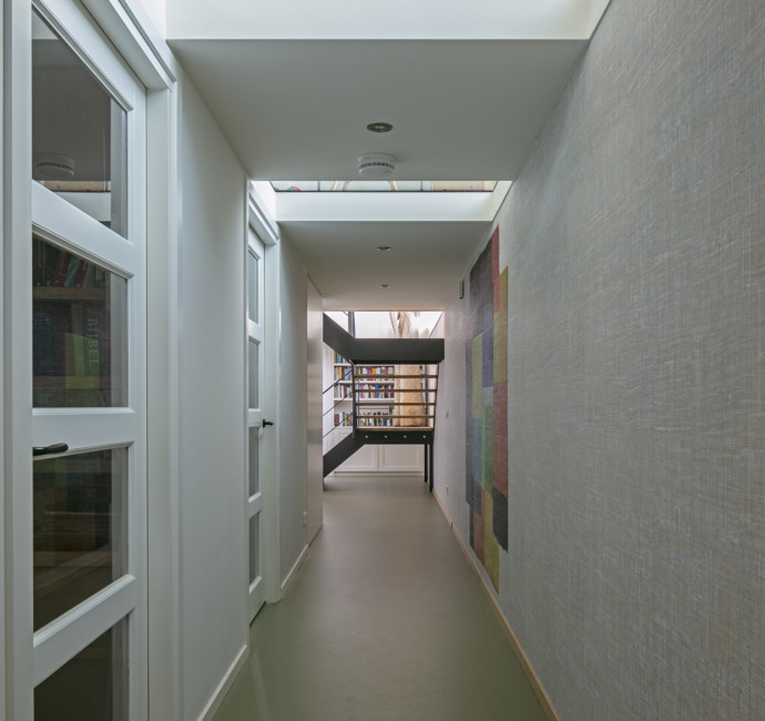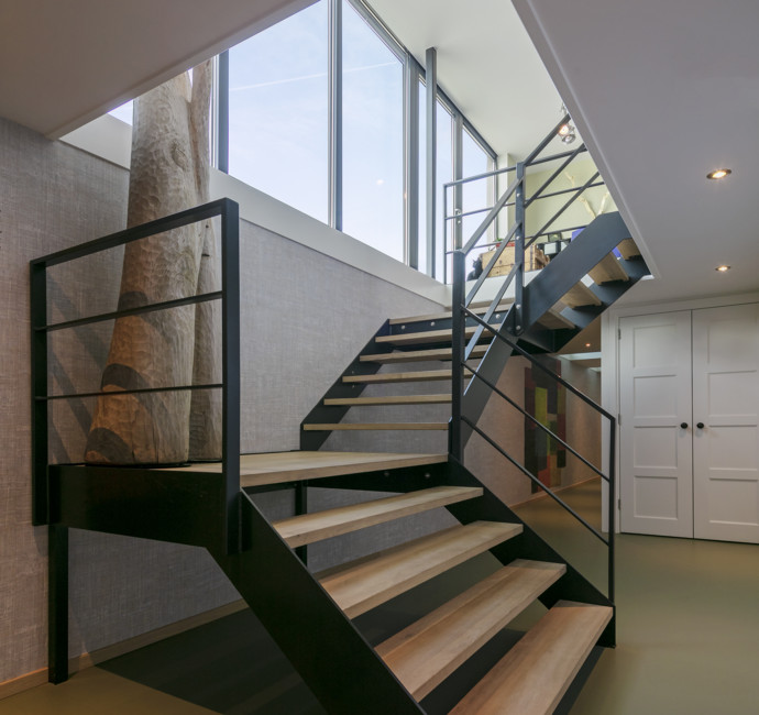 Een riante trap in drie delen staat in de forse vide. Zo ontstaat beneden geen halletje of gang maar een extra kamer. Op vernuftige wijze heeft Bob Ronday licht tot in de slaapkamers die onder water liggen door laten dringen; in de begane grond vloer is beloopbaar glas geplaatst, precies voor de glazen deuren naar het terras. Het licht valt zo door de vloer op de wederom glazen deuren naar de slaapkamers. In de keukenkastjes verborgen koekoeken bieden de benedenverdieping natuurlijke ventilatie. Door slimme architectuur heb je in niets het gevoel in een kelder of souterrain te zijn.