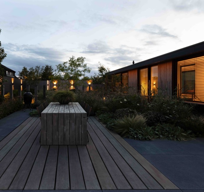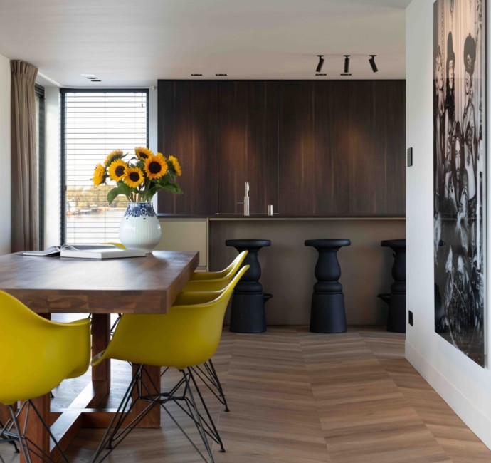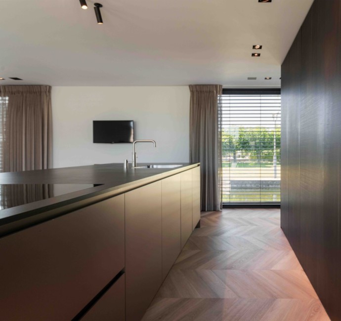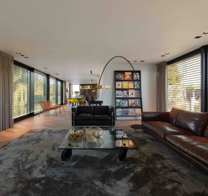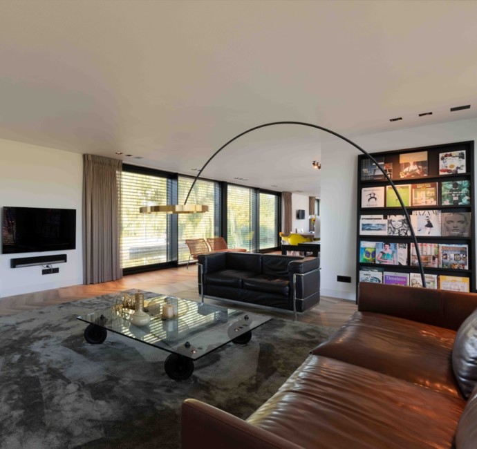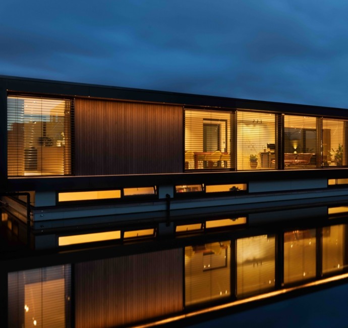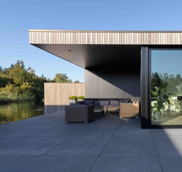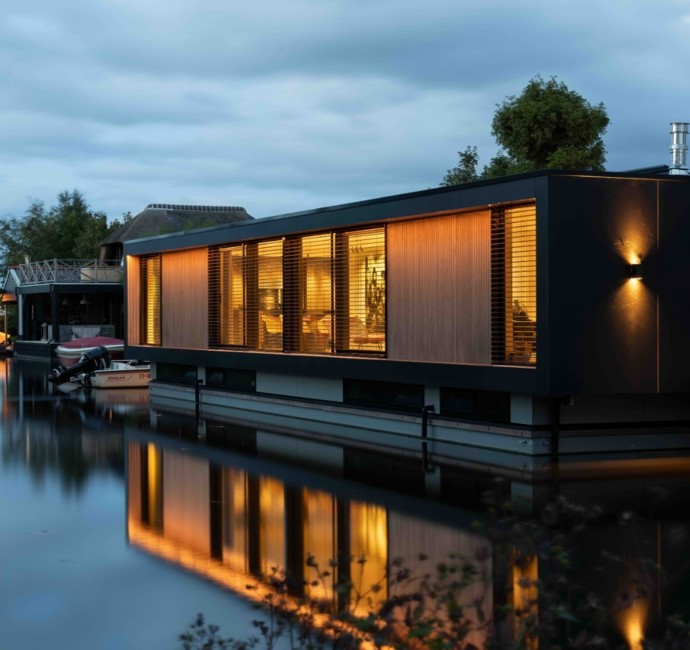 Studio 110 architectuur ontwierp deze drijvende villa. In dit imposante huis loop je rond als op het dek van een schip. De opdrachtgevers wilden zich in de woning voortdurend verbonden voelen met zowel het water als de tuin. 'Fans' van licht, lucht en ruimte! Daarom werd gekozen voor een grote leefruimte met glas aan beide kanten. Dit geeft zicht op de Vinkeveense plassen evenals op de tuin.