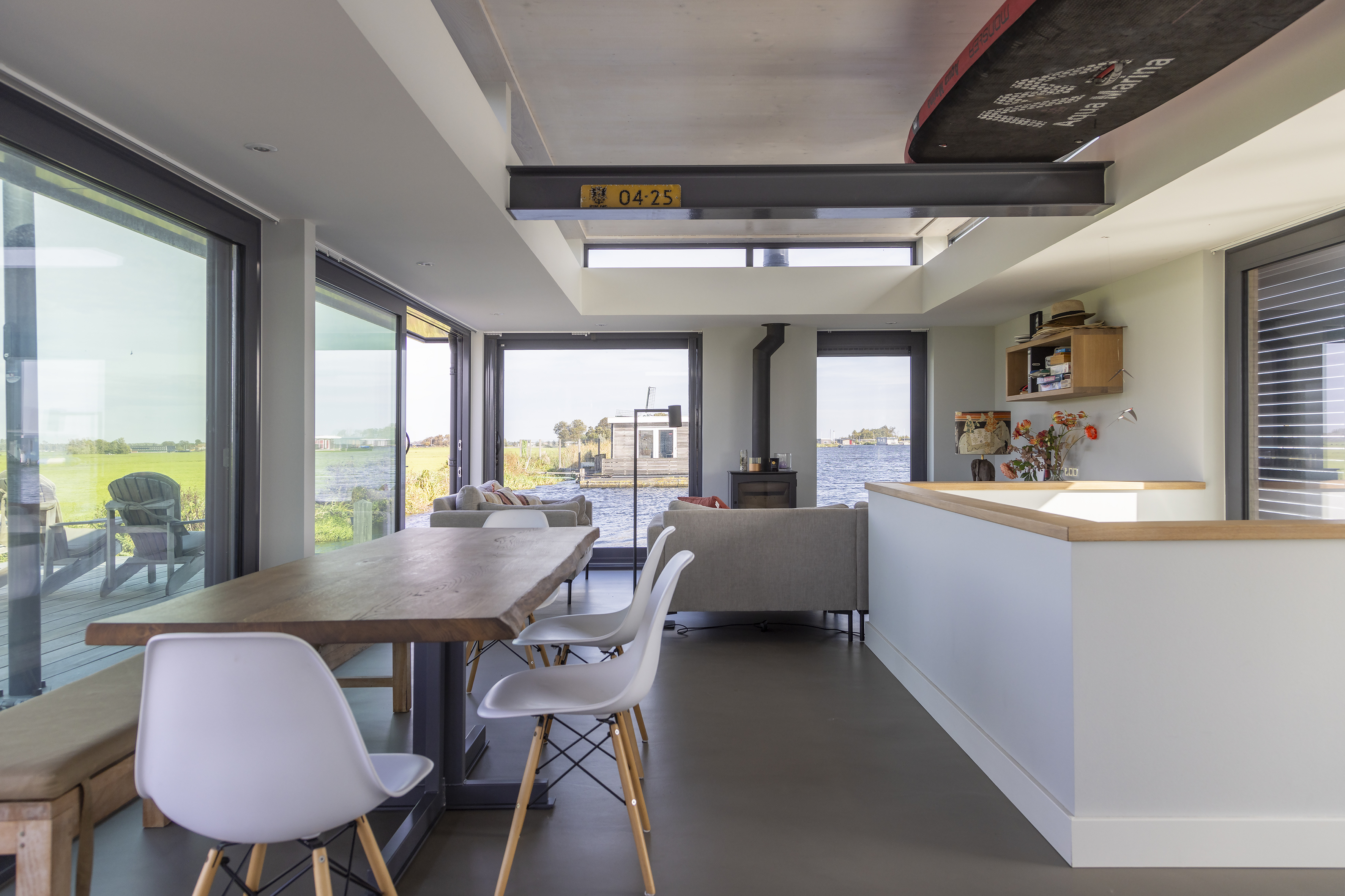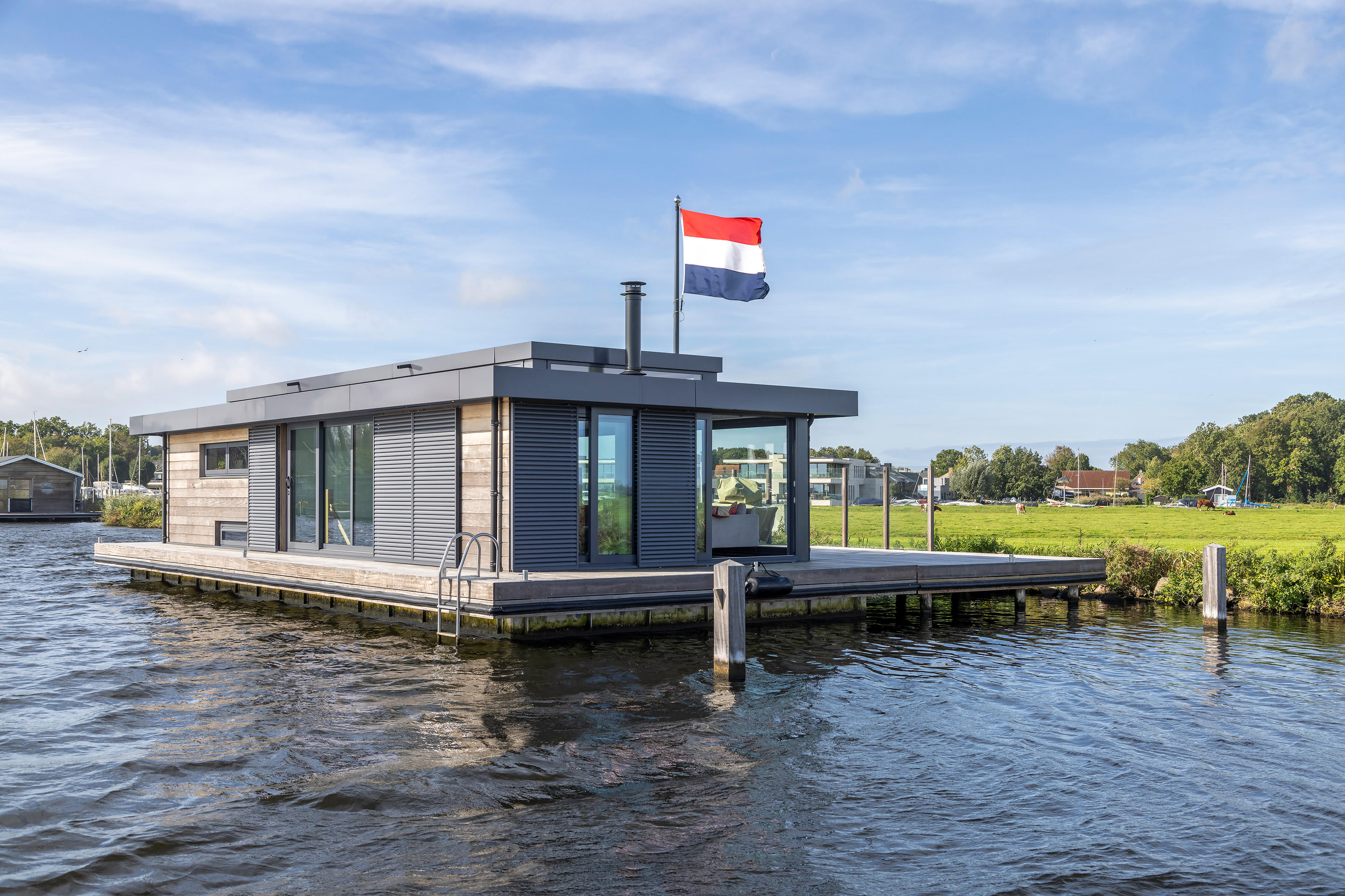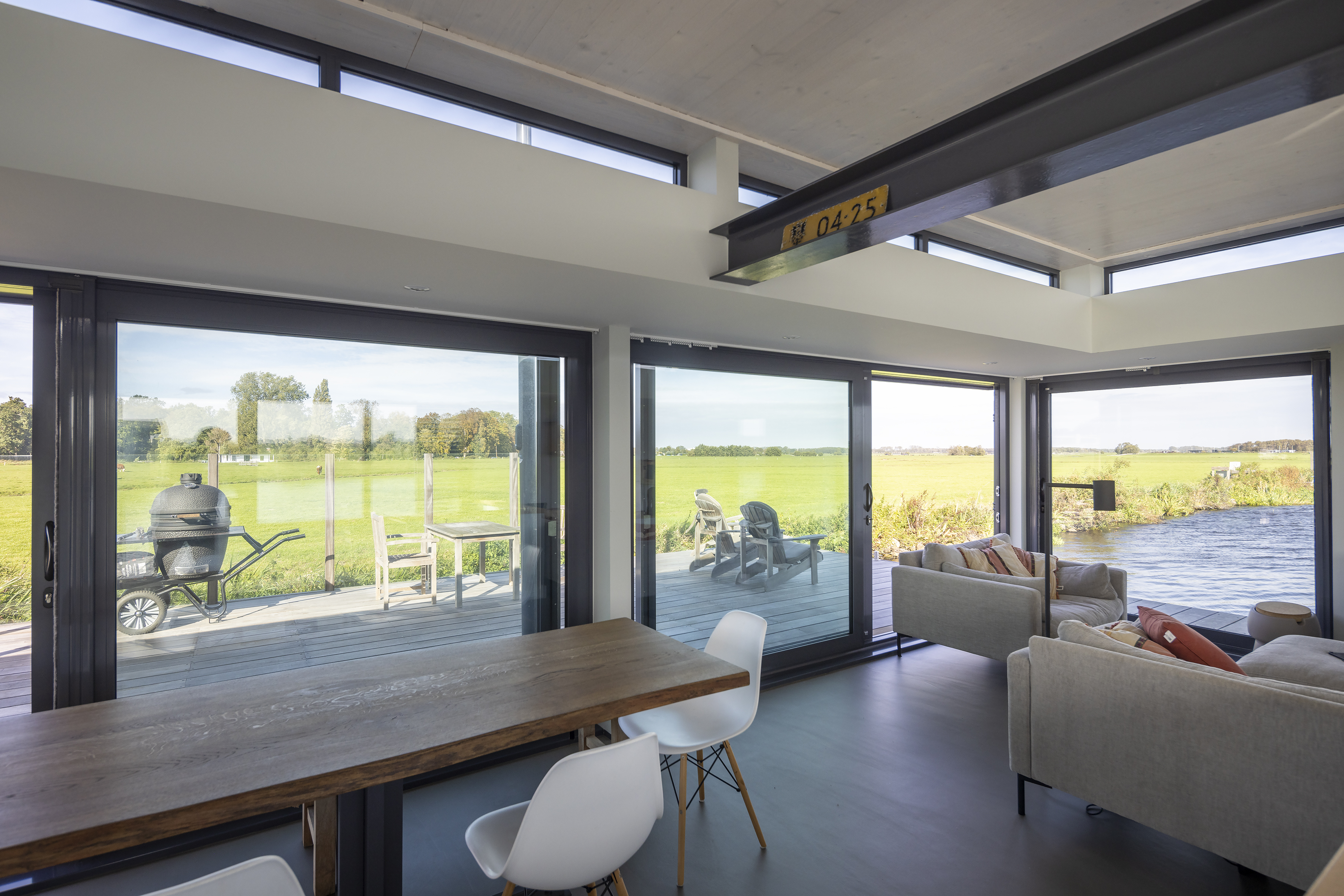 Het exterieur heeft open en gesloten zijden. De gesloten geveldelen bieden privacy wanneer er veel mensen op het water zijn. De open geveldelen zorgen voor de connectie tussen binnen en buiten en bieden uitzicht over het uitgestrekte weiland.